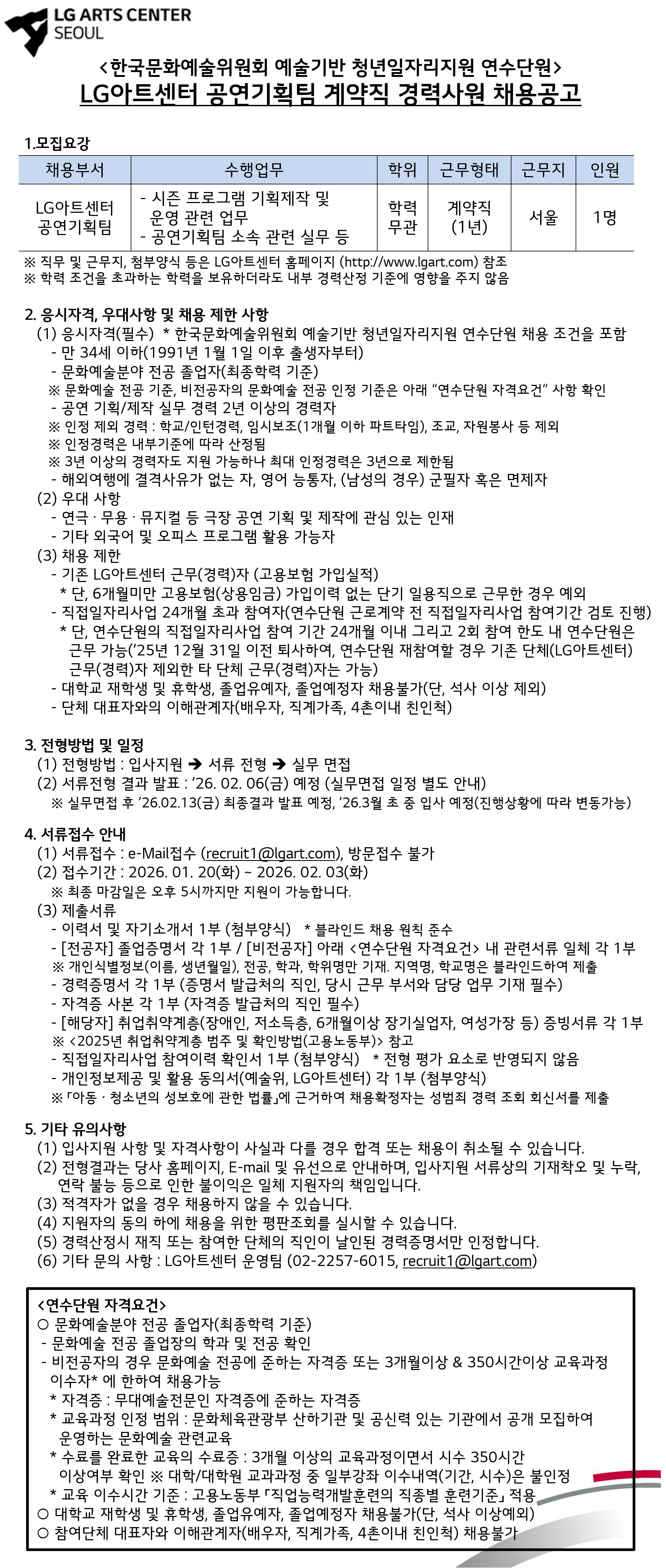 [엘지연암문화재단] LG아트센터 공연기획팀 계약직 경력사원 채용공고(한국문화예술위원회 문화예술 연수단원 지원)