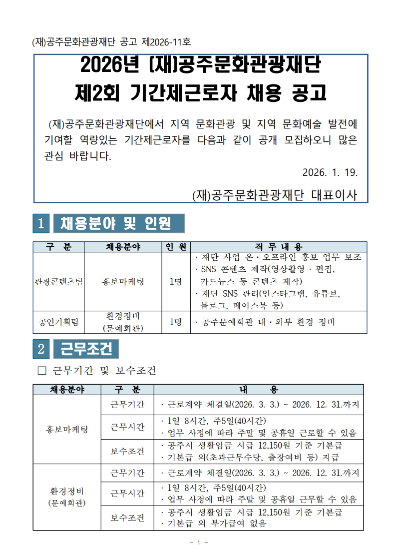 [전국지역문화재단연합회] [(재)공주문화관광재단] 2026년 제2회 기간제근로자 채용 공고
