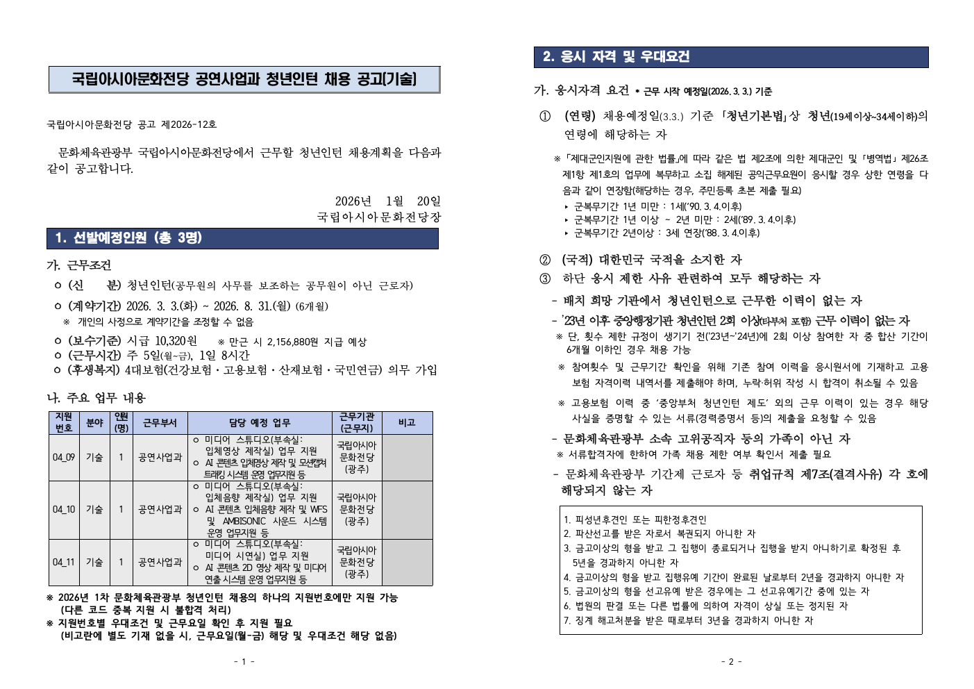 [국립아시아문화전당 ] 국립아시아문화전당 공연사업과 청년인턴 채용 공고(기술)