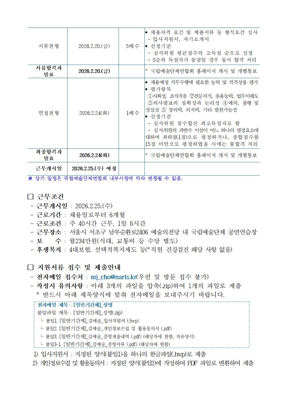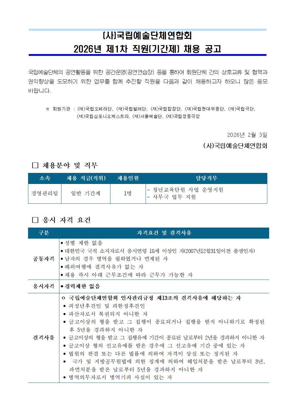 [(사)국립예술단체연합회] (사)국립예술단체연합회 2026년 제1차 직원[기간제] 채용 공고