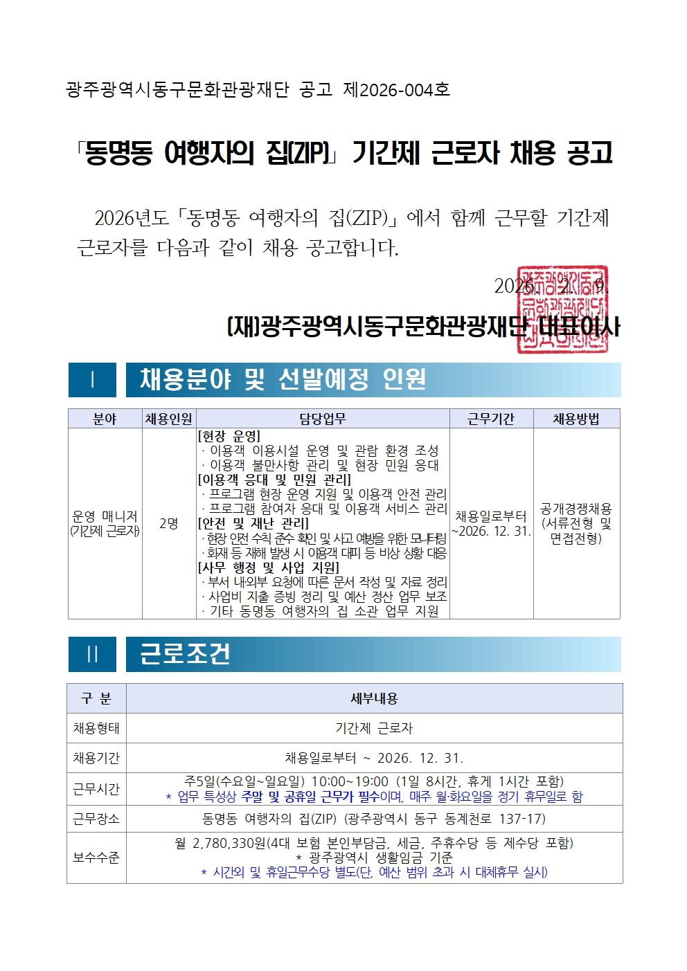 [(재)광주동구문화관광재단] 2026 동명동 여행자의 집(ZIP) 기간제 근로자 채용 공고