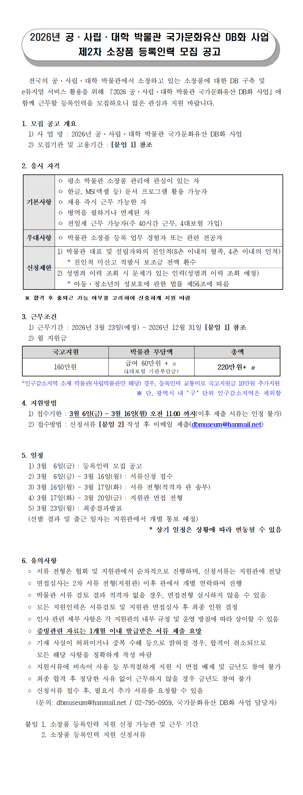 [한국박물관협회] 2026 공 사립 대학 박물관 국가문화유산 DB화 사업 제 2차 소장품 등록인력 모집 공고