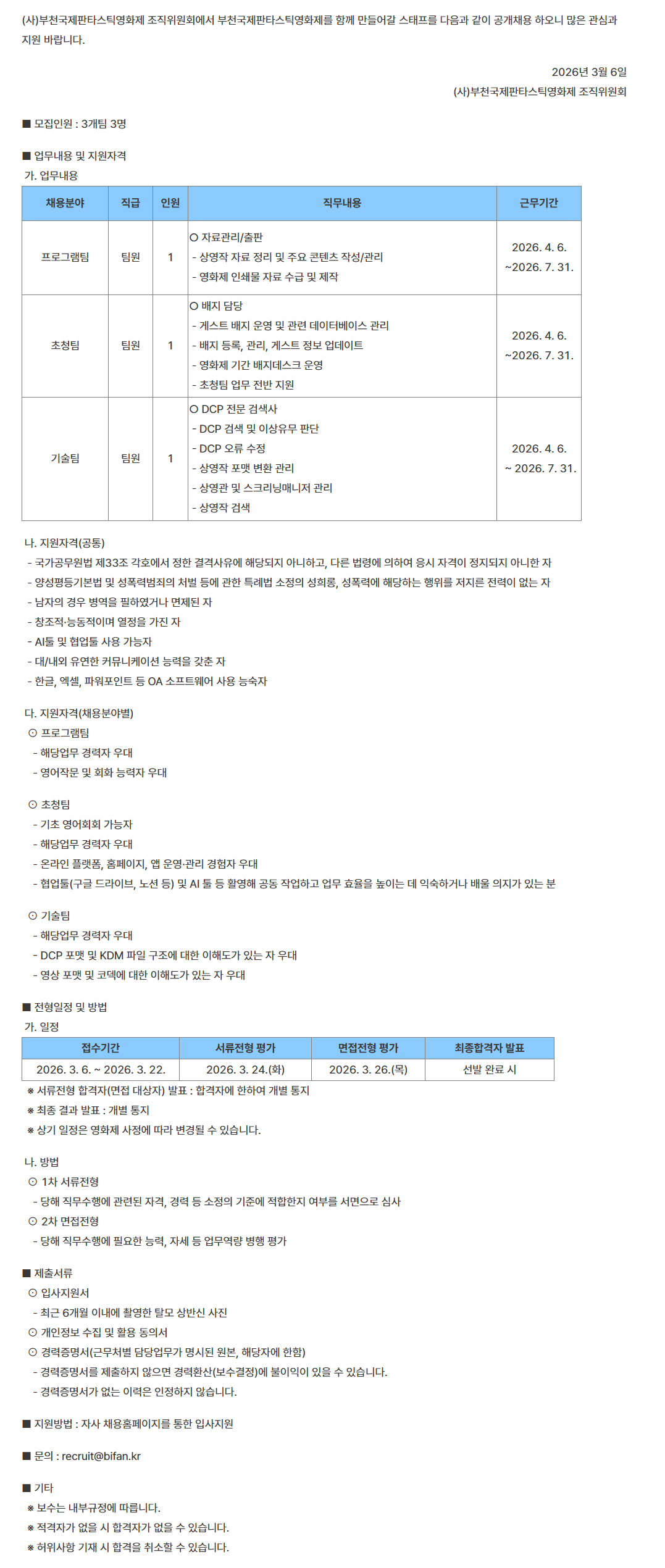 부천국제판타스틱영화제 채용 2차(프로그램팀, AI교육팀, 기술팀, 뉴미디어팀, 기획운영팀, 온라인팀)