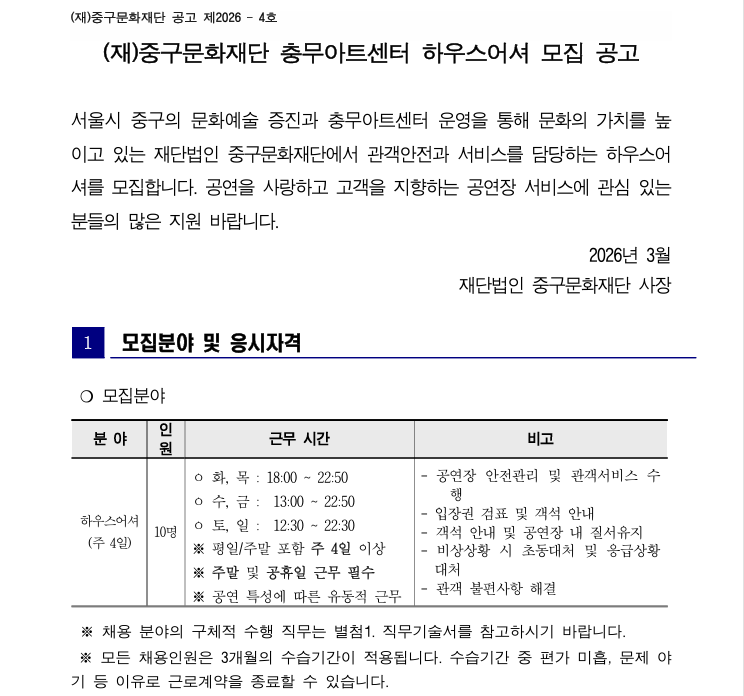 [재단법인중구문화재단] 충무아트센터 하우스어셔 모집(~3/18)