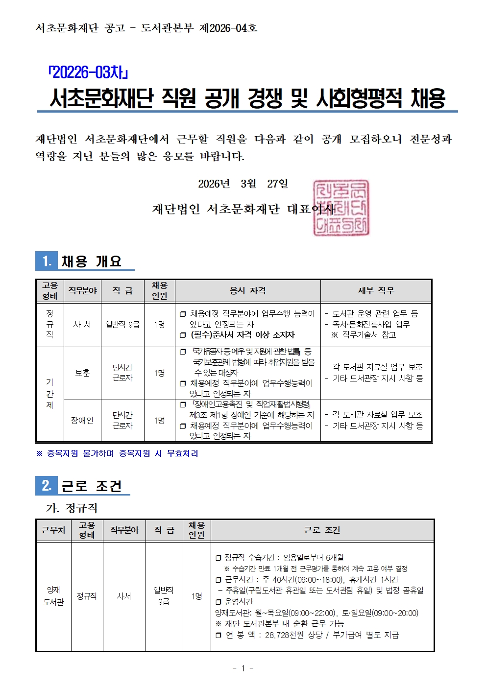 2026년 제1차 직원 채용 공고