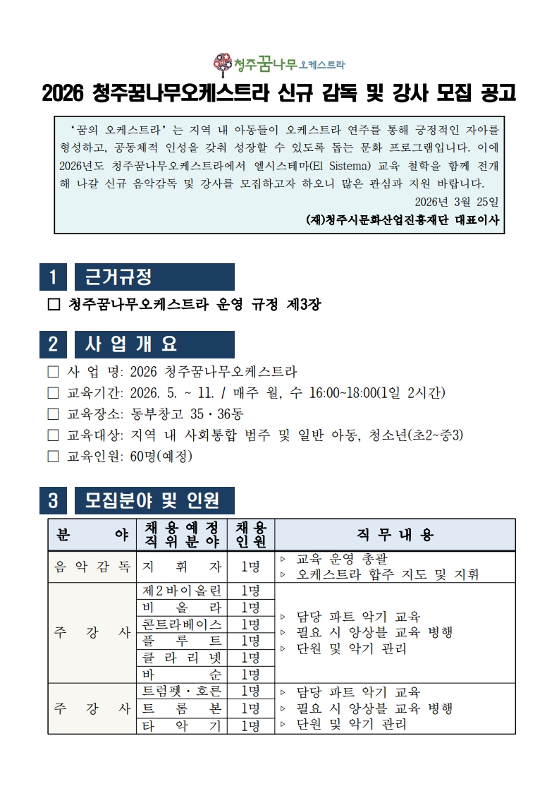 [(재)청주시문화산업진흥재단] <2026 청주꿈나무오케스트라 신규 감독 및 강사 모집>