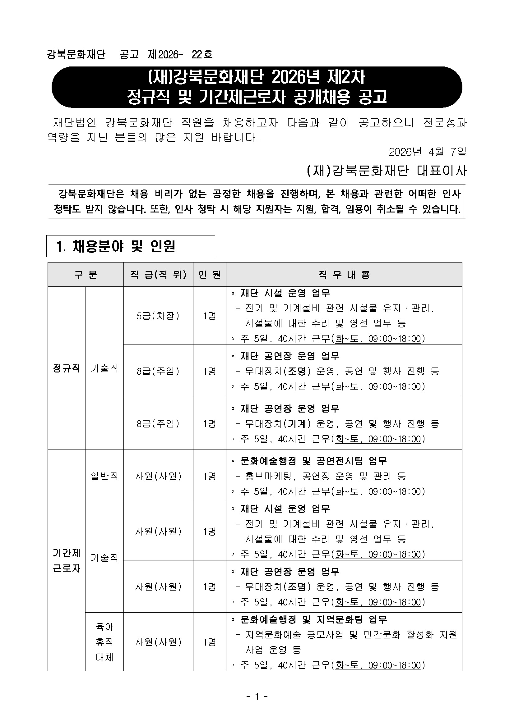 [재단법인 강북문화재단] [재]강북문화재단 2026년 제2차 정규직 및 기간제근로자 공개채용 공고