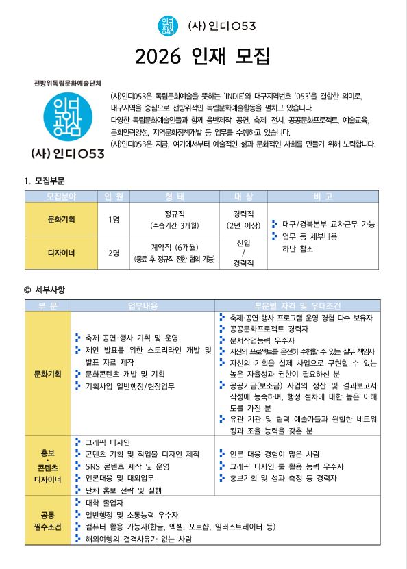 [사단법인 인디053] [회원등록공고] 2026 축제·공연 기획(경력직) 및 디자이너 인재모집