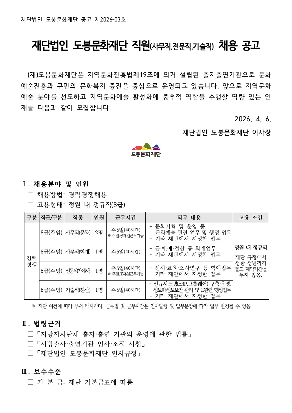 [도봉문화재단] [제2026-03호] 도봉문화재단 직원 채용 공고