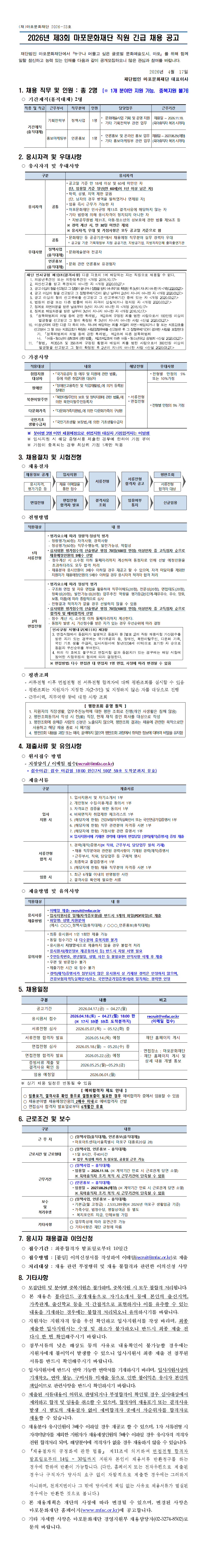 [마포문화재단] 2026년 제3회 마포문화재단 직원 긴급 채용 공고(~04.27.(월) 18:00 한)