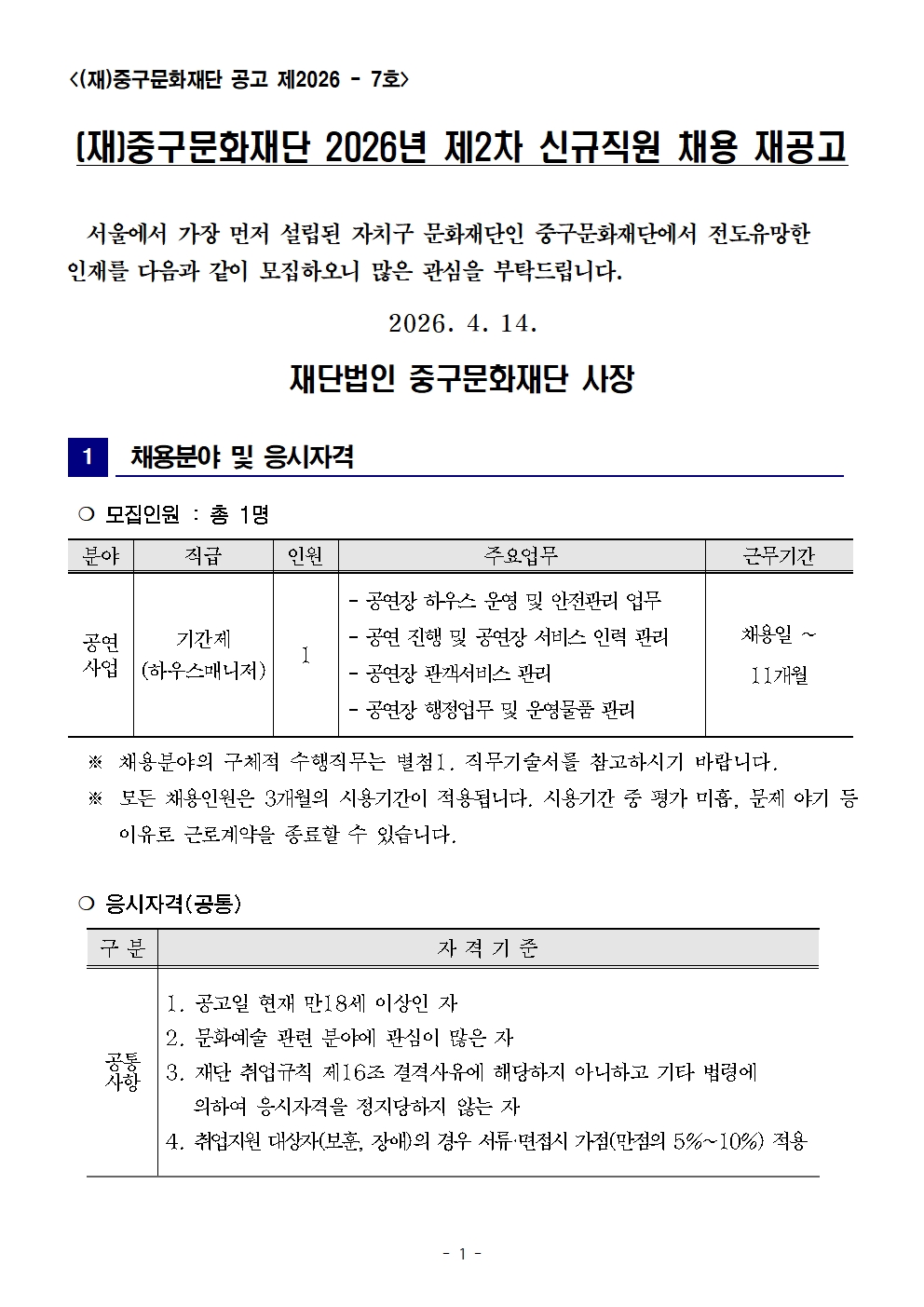 2026년 제2회 마포문화재단 직원 채용 재공고(~04.27.(월) 18:00 한)