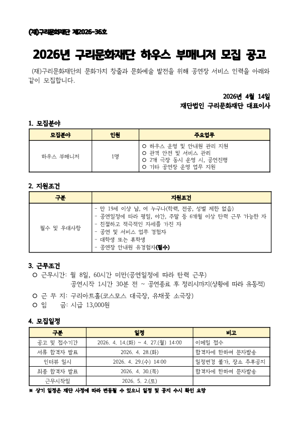 [(재)구리문화재단] (복사) 2026년 구리문화재단 하우스 부매니저 모집 공고