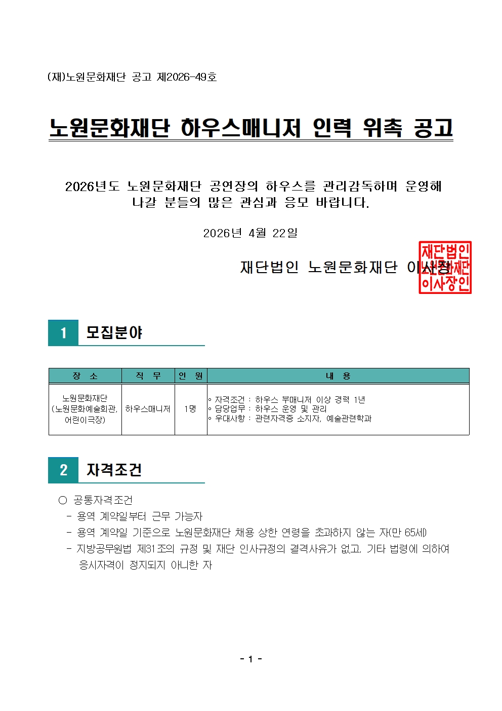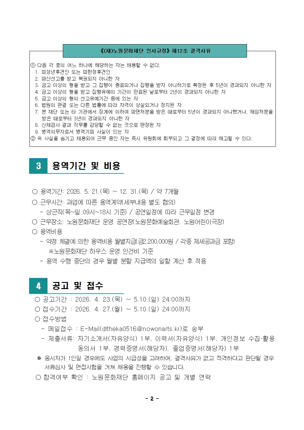 노원문화재단 2026년 제4차 공개채용 공고(제한경쟁)