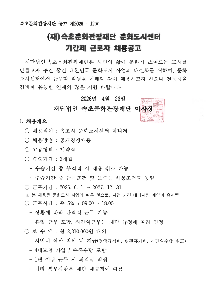 [아트모아] (재)속초문화관광재단 문화도시센터 기간제 근로자 채용공고