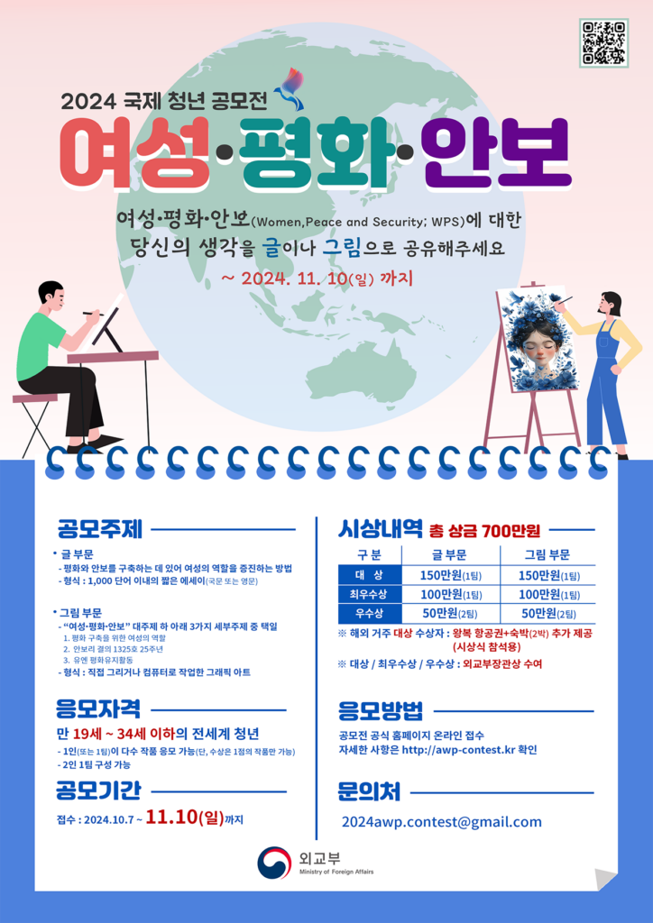 우리 정부는 2019년도부터 매년 ‘여성과 함께하는 평화 국제회의’를 개최하고 있습니다. 동 회의는 국제 평화와 안보 분야에서 여성의 목소리를 높이기 위한 중요한 플랫폼 역할을 해왔습니다. 제6차 여성과 함께하는 평화 국제회의의 부대행사로서 여성·평화·안보 의제에 대한 청년층의 관심 및 인식을 높이기 위해 국제 청년 글·그림 공모전을 개최하였습니다.