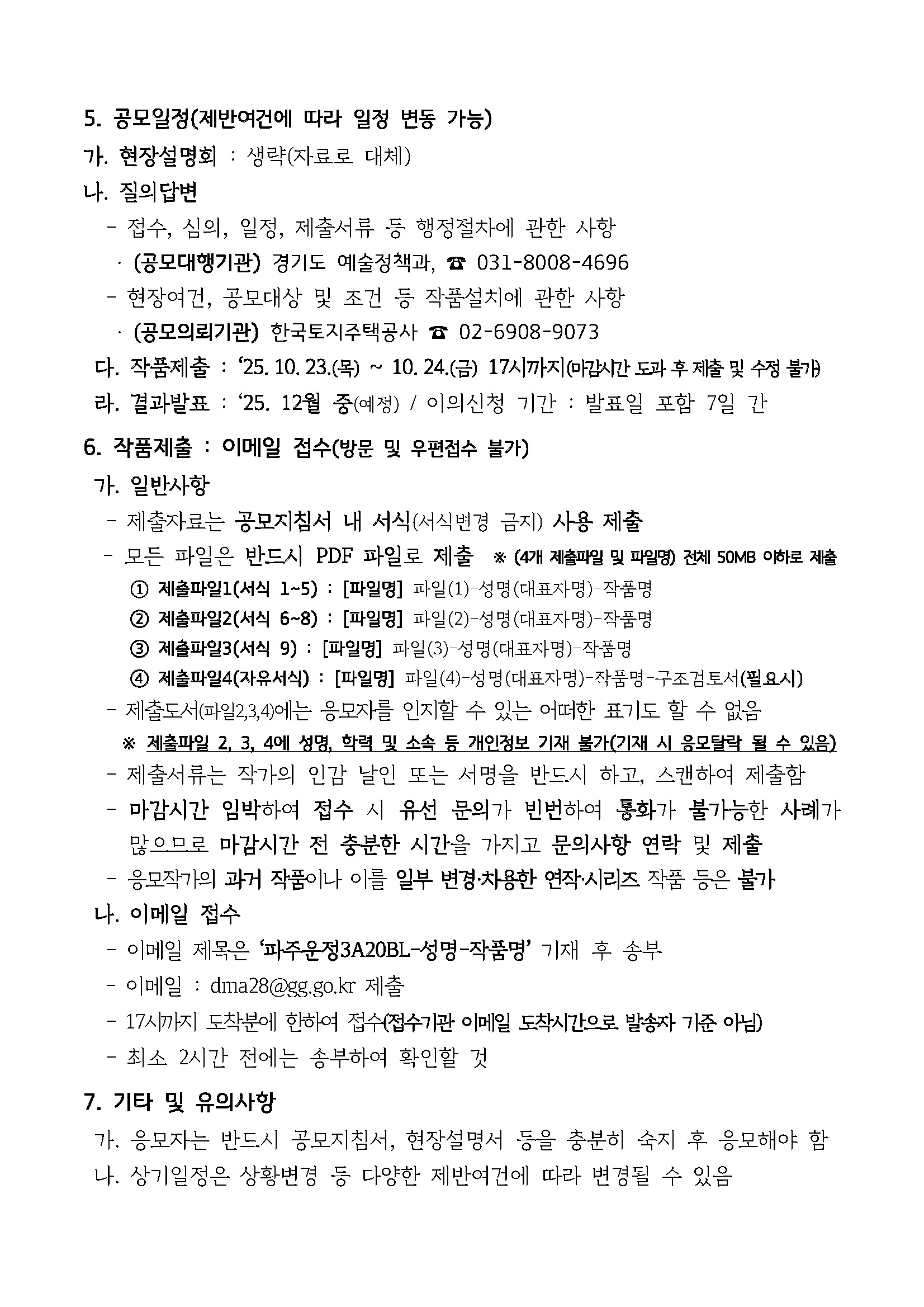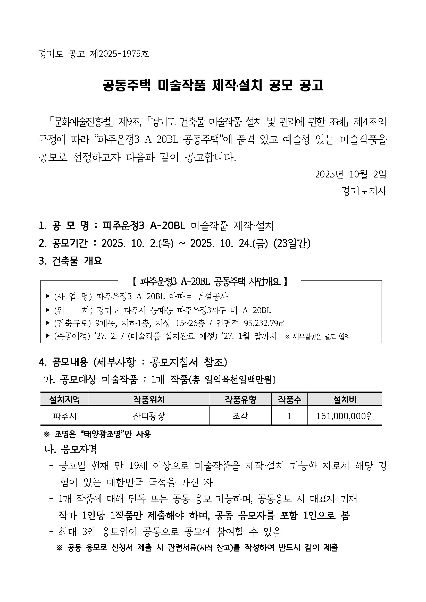 [예술경영지원센터(공모/기금/행사)] 파주운정3 A-20BL 공동주택 미술작품 제작·설치 공모 공고