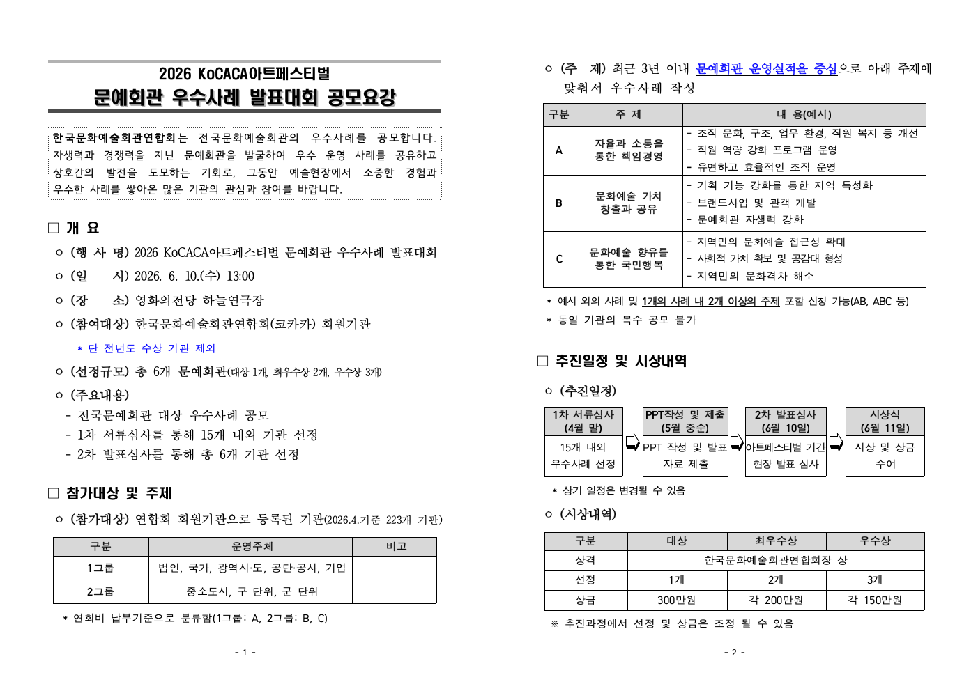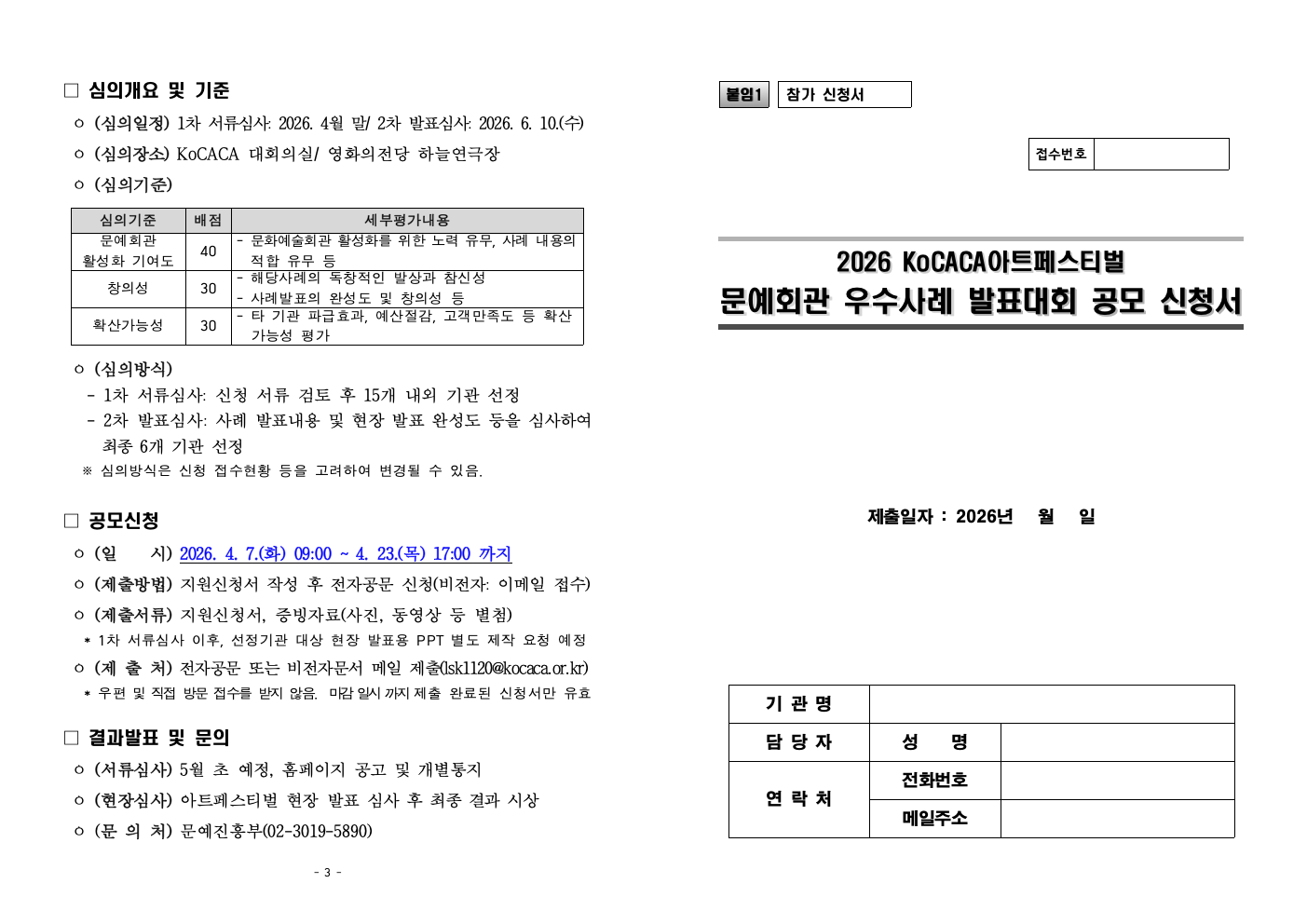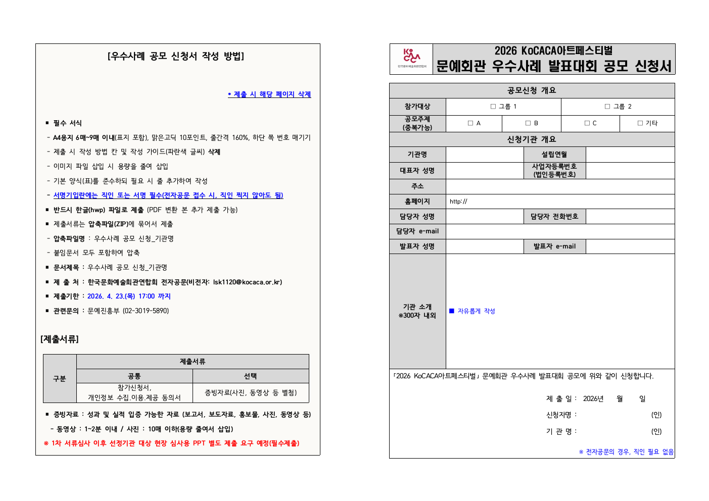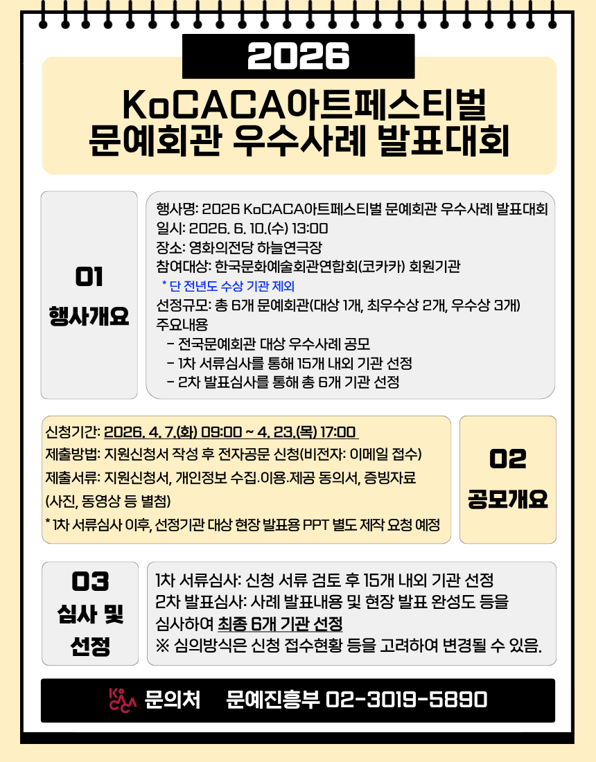 20260403044414_[붙임]2026KoCACA아트페스티벌문예회관우수사례발표대회공모요강(참가신청서포함).hwp