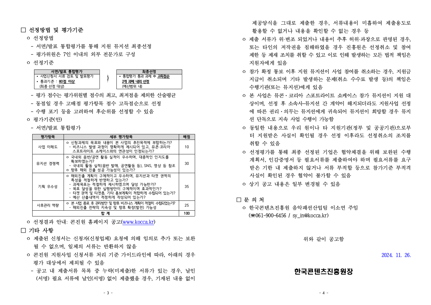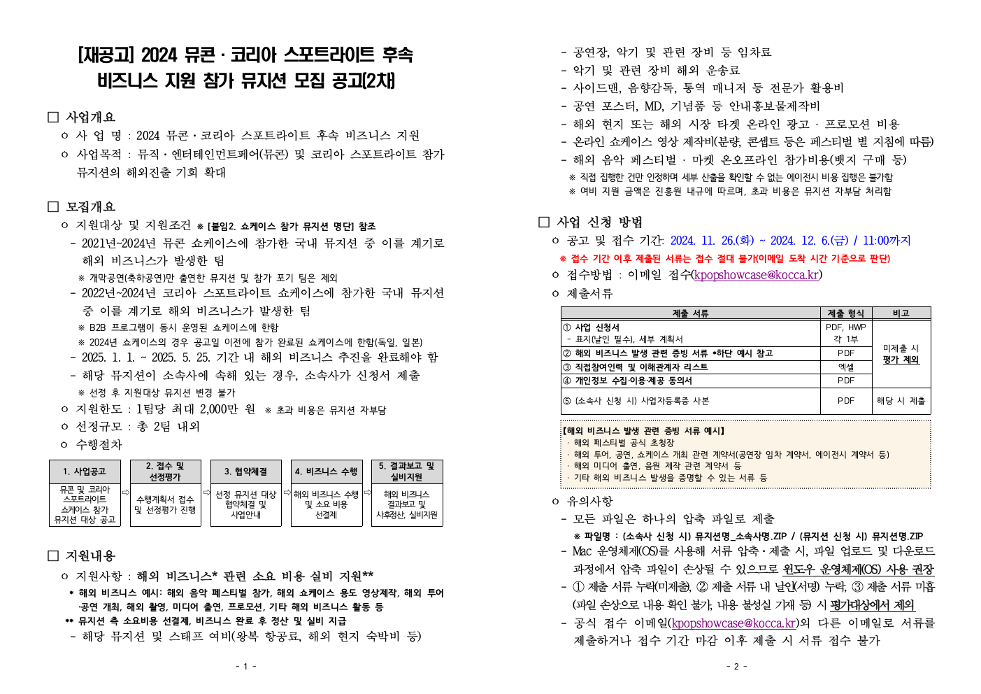 20241128083501_붙임1. 공고문_2024 뮤콘·코리아 스포트라이트 후속 비즈니스 지원(2차) 재공고.hwp
