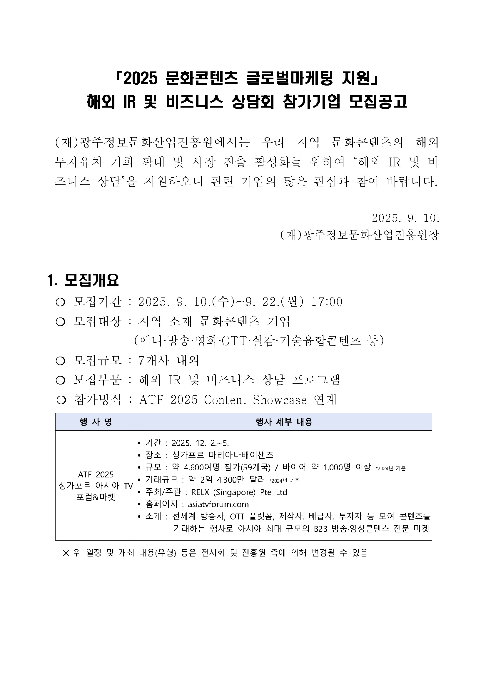 [광주정보문화산업진흥원] 「2025 문화콘텐츠 글로벌마케팅 지원」해외 IR 및 비즈니스 상담 참가기업 모집 공고