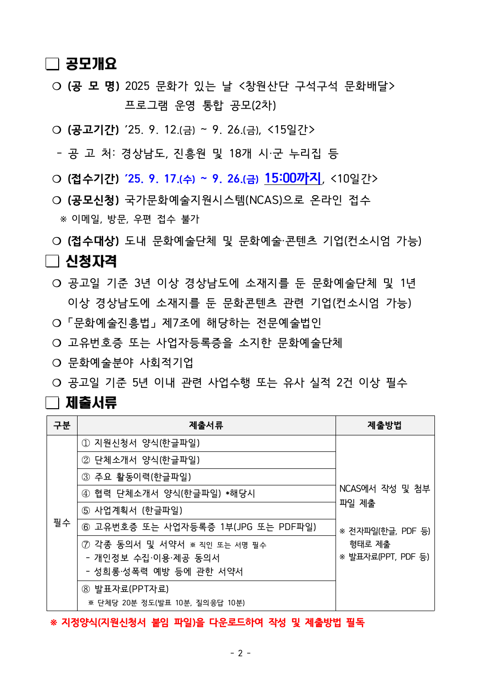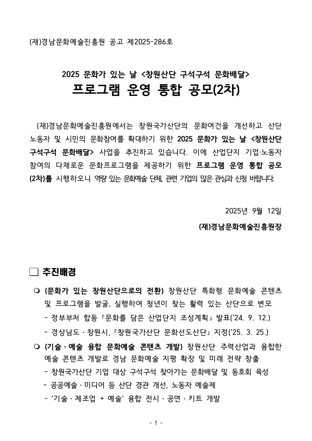 [경남문화예술진흥원] 2025 문화가 있는 날 창원산단 구석구석 문화배달 프로그램 운영 통합 공모(2차)