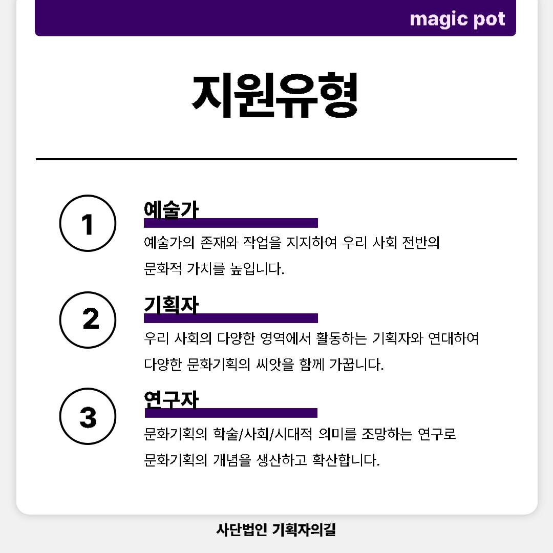 매직팟은 예술가, 기획자, 연구자를 지원합니다.