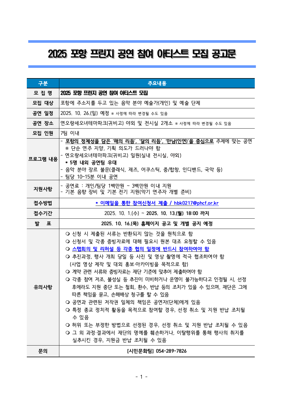 [포항문화재단] 2025 포항 프린지 공연 참여 아티스트 모집 공고
