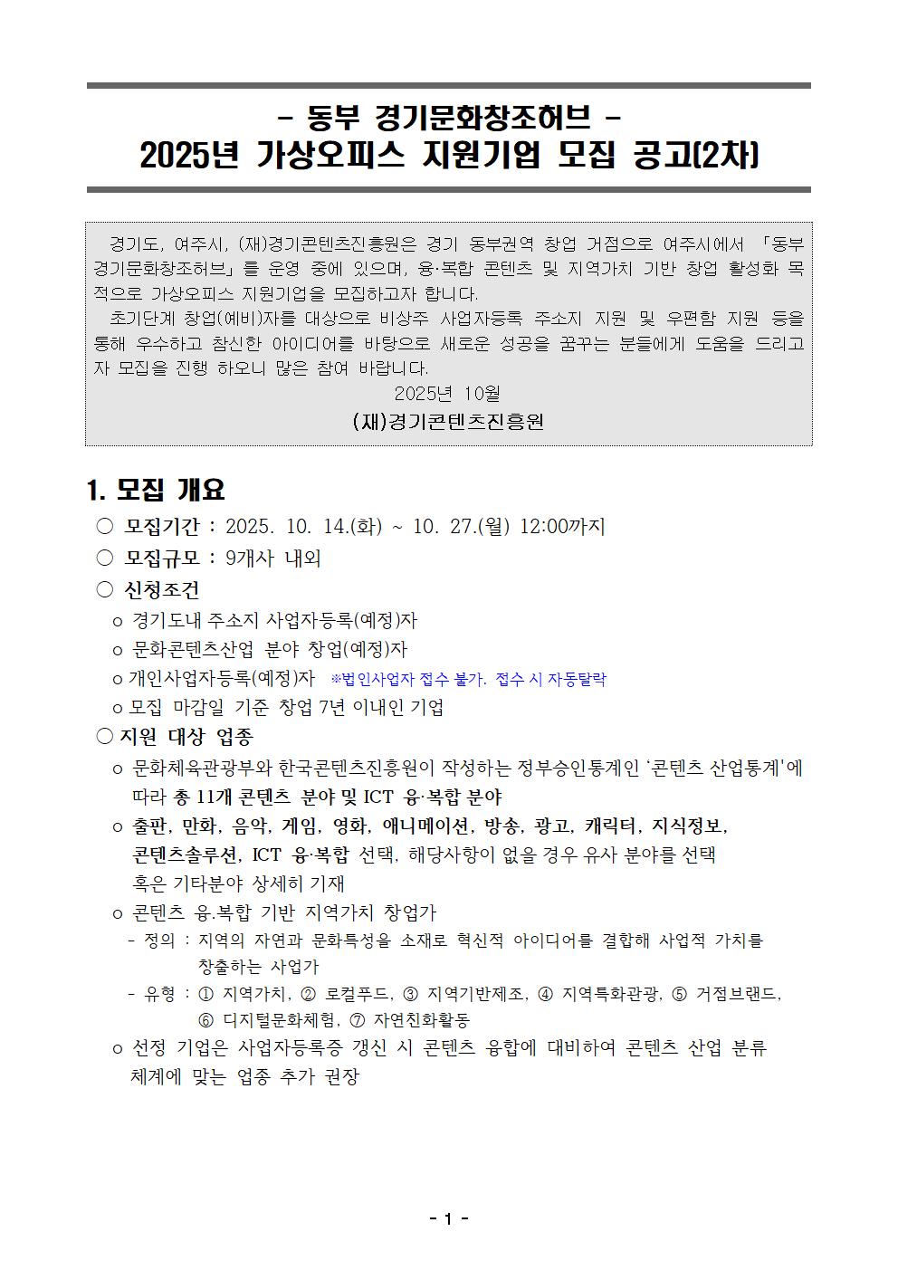 20251014054932_[공고문] 동부 경기문화창조허브 2025년 가상오피스 지원기업 모집 공고(2차)_251001.hwp