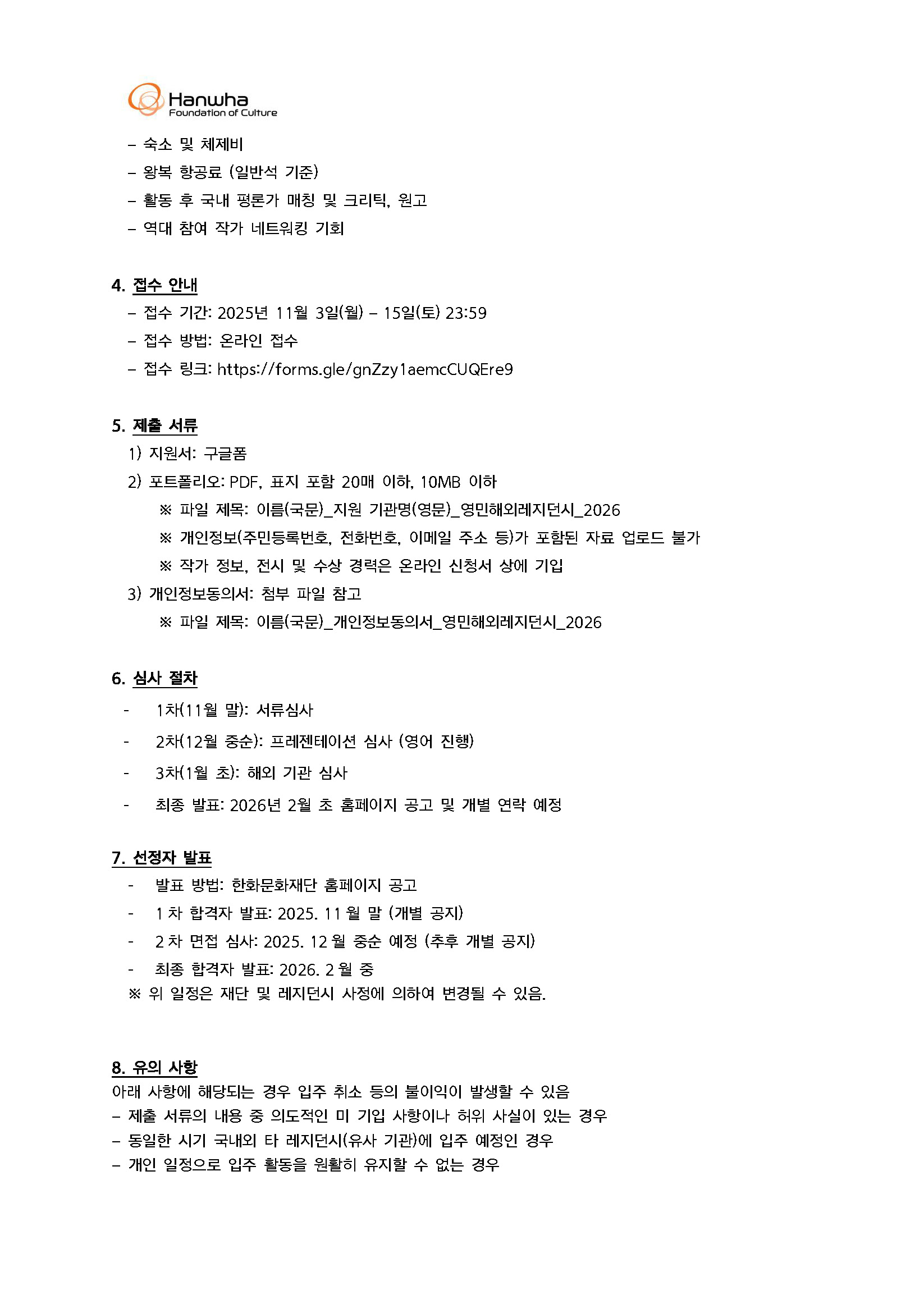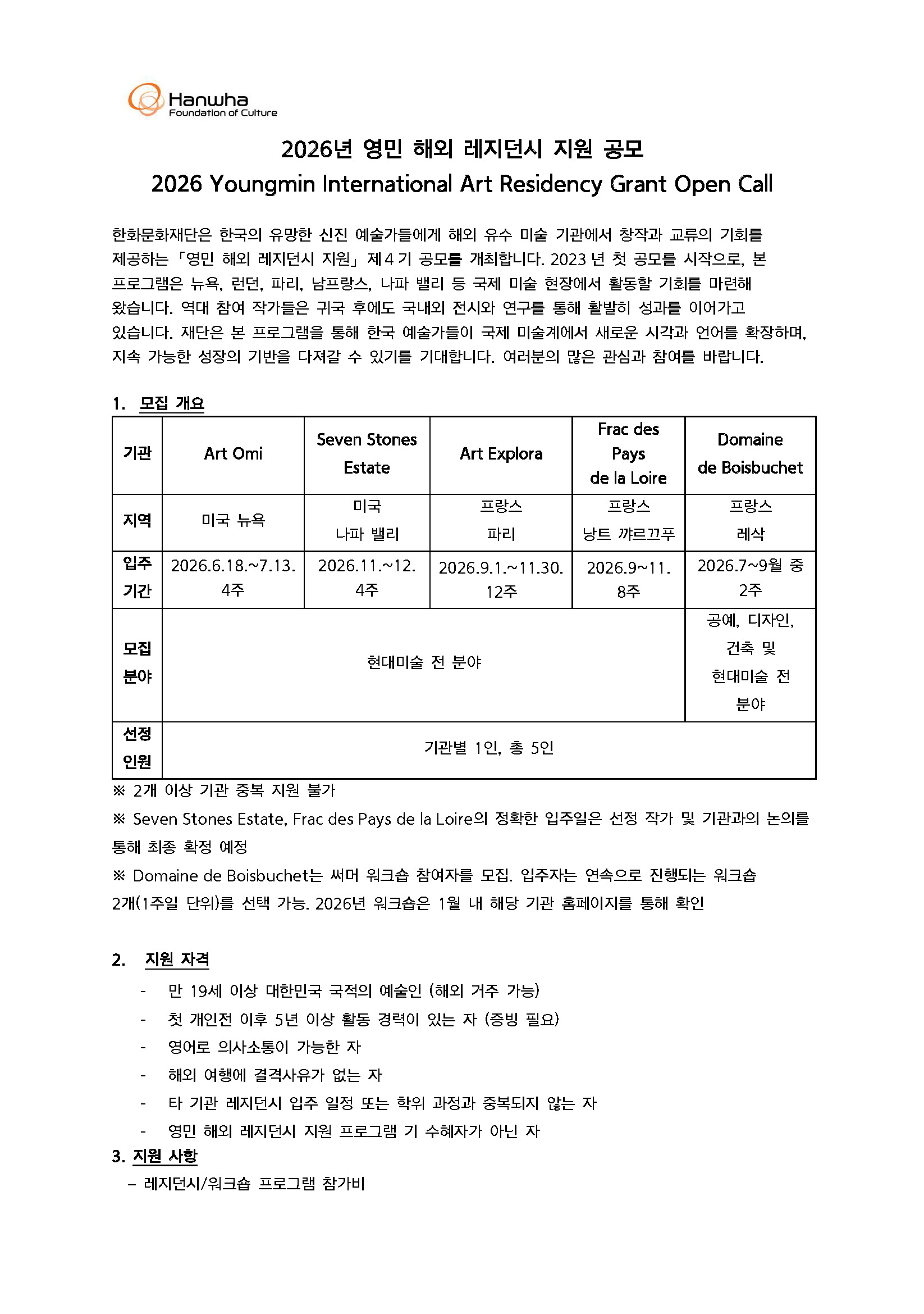 [한화문화재단] 「2026년 영민 해외 레지던시 지원」 공모 안내