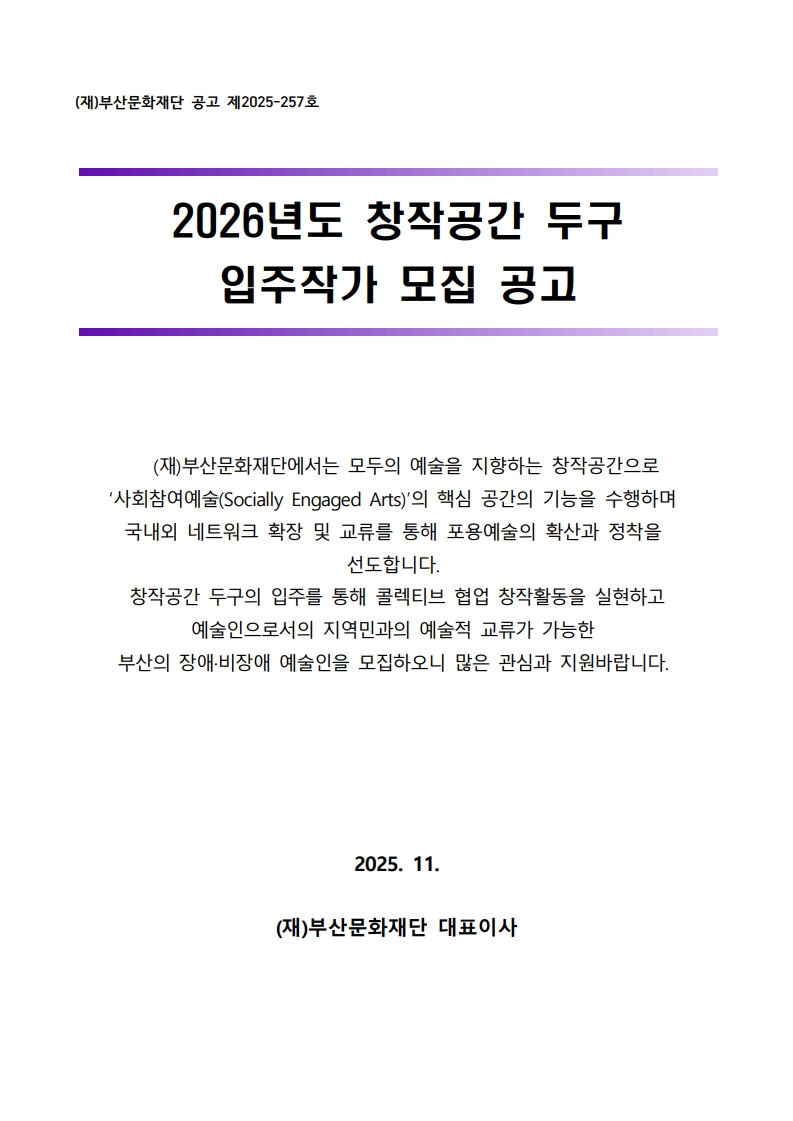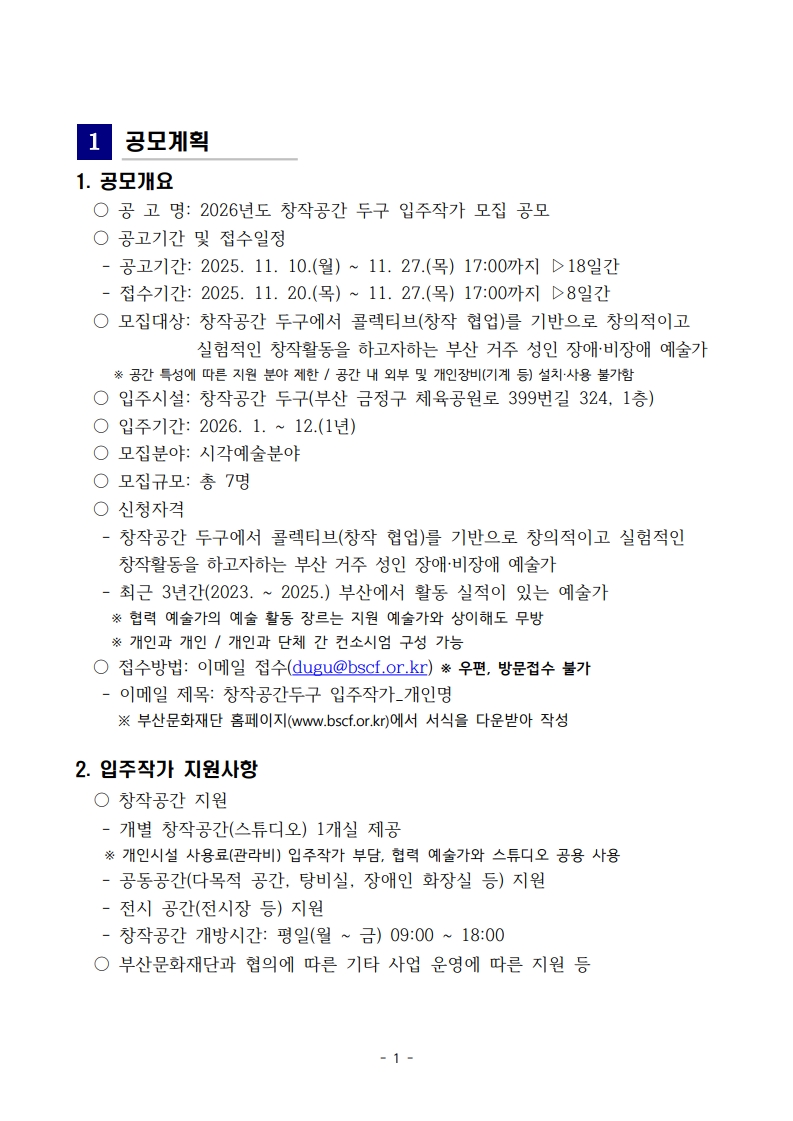 [부산문화재단] [공고] 2026년도 창작공간 두구 입주작가 공모