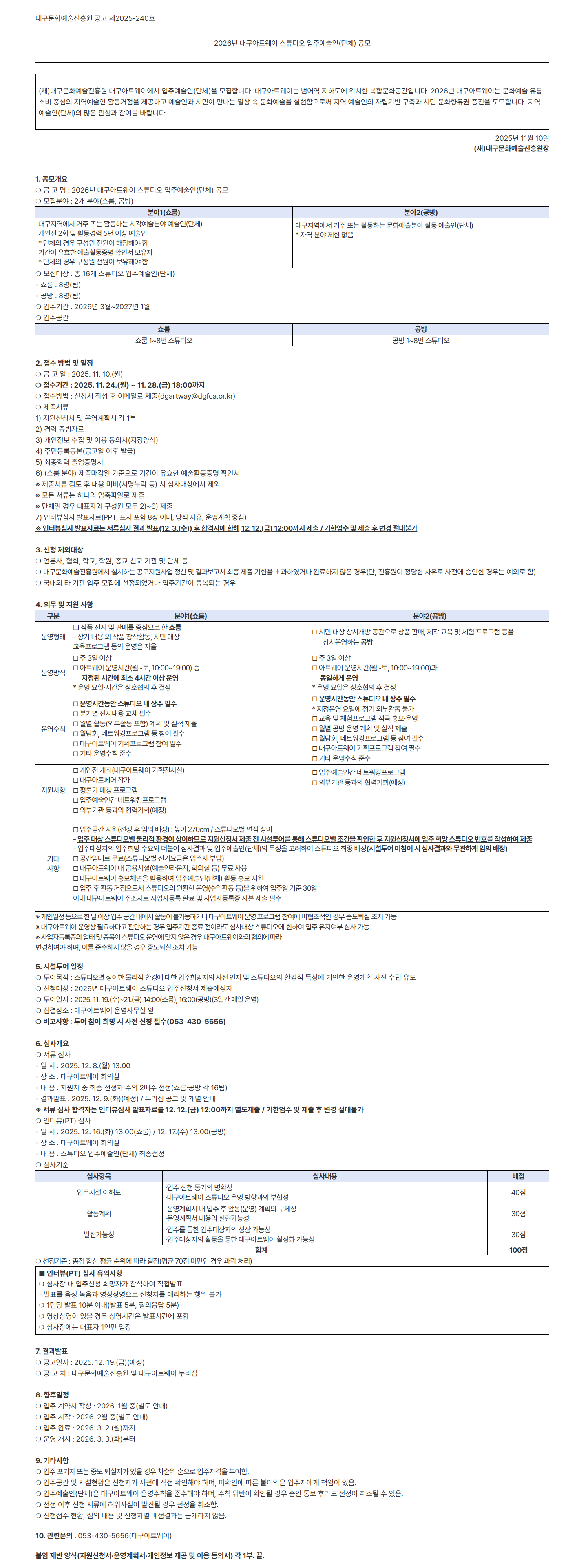 [대구문화예술진흥원] 2026년 대구아트웨이 스튜디오 입주예술인(단체) 공모