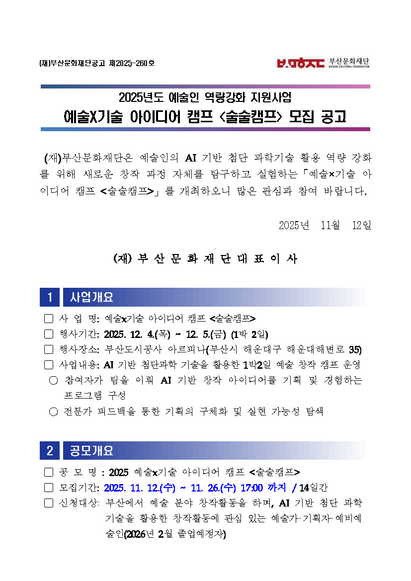 [부산문화재단] [모집] 예술x기술 아이디어 캠프 <술술캠프> 참여 예술가 모집