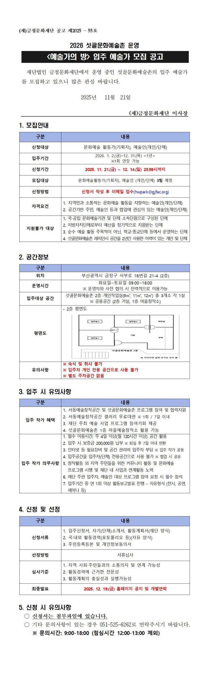[금정문화재단] 2026년 섯골문화예술촌 레지던시 <예술가의 방> 입주예술가 모집