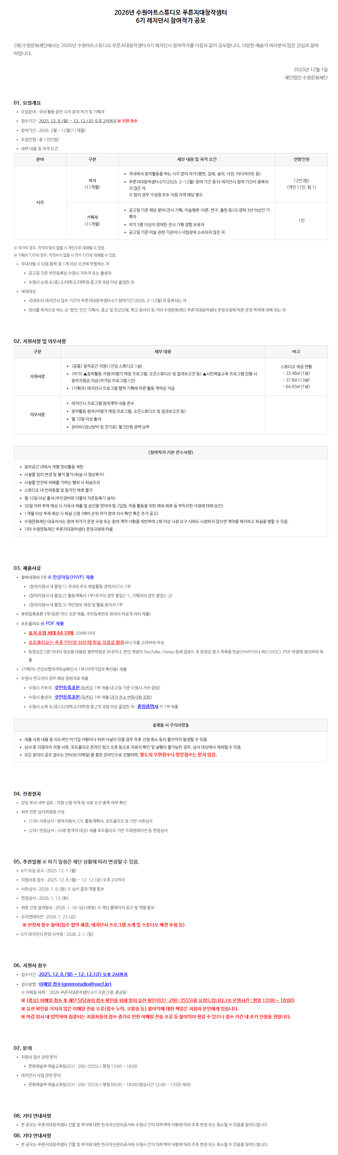 [수원문화재단] 2026년 수원아트스튜디오 푸른지대창작샘터 6기 레지던시 참여작가 공모