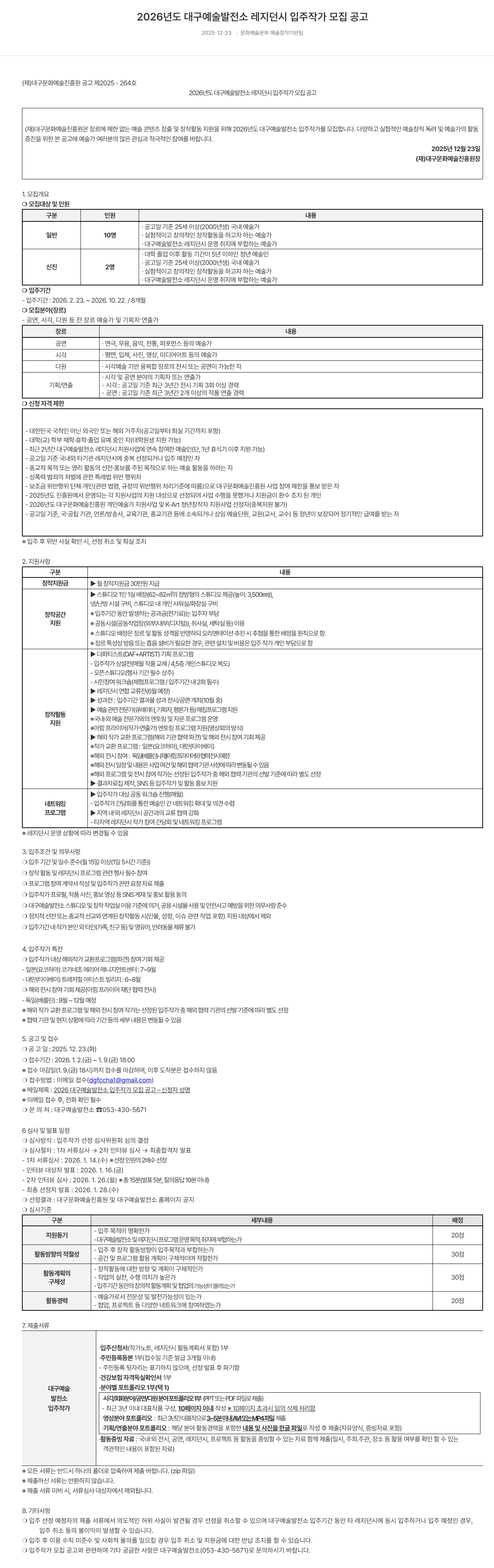 [대구문화예술진흥원] 2026년도 대구예술발전소 레지던시 입주작가 모집 공고