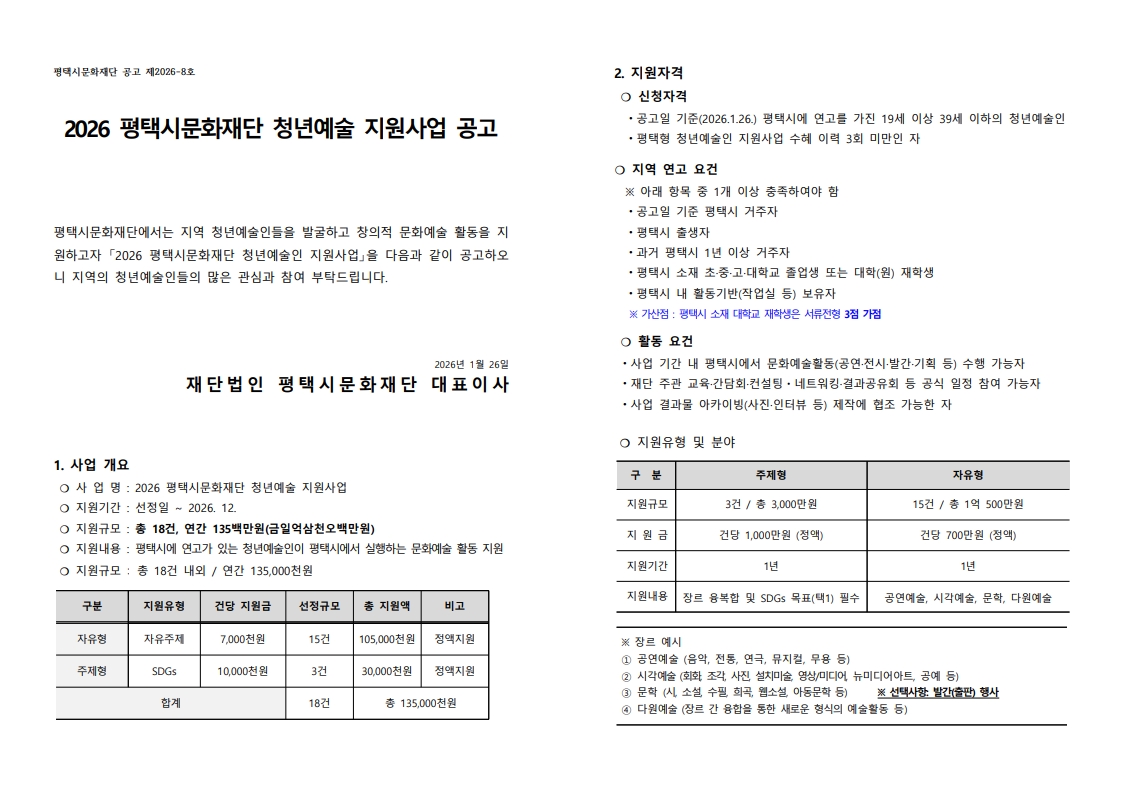 [평택시문화재단] 2026 평택시문화재단 청년예술 지원사업 공고