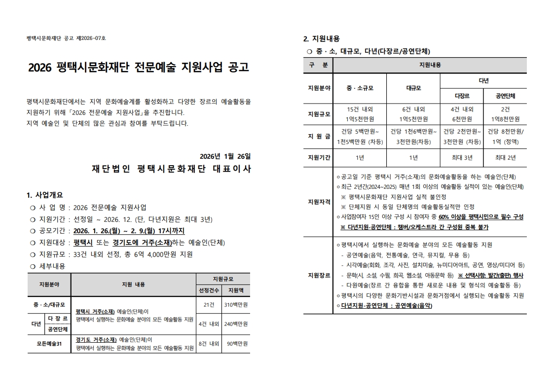 [평택시문화재단] 2026 평택시문화재단 전문예술 지원사업 공고