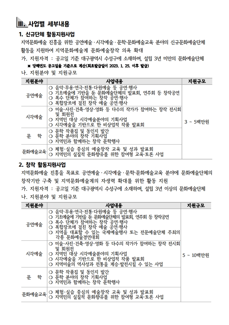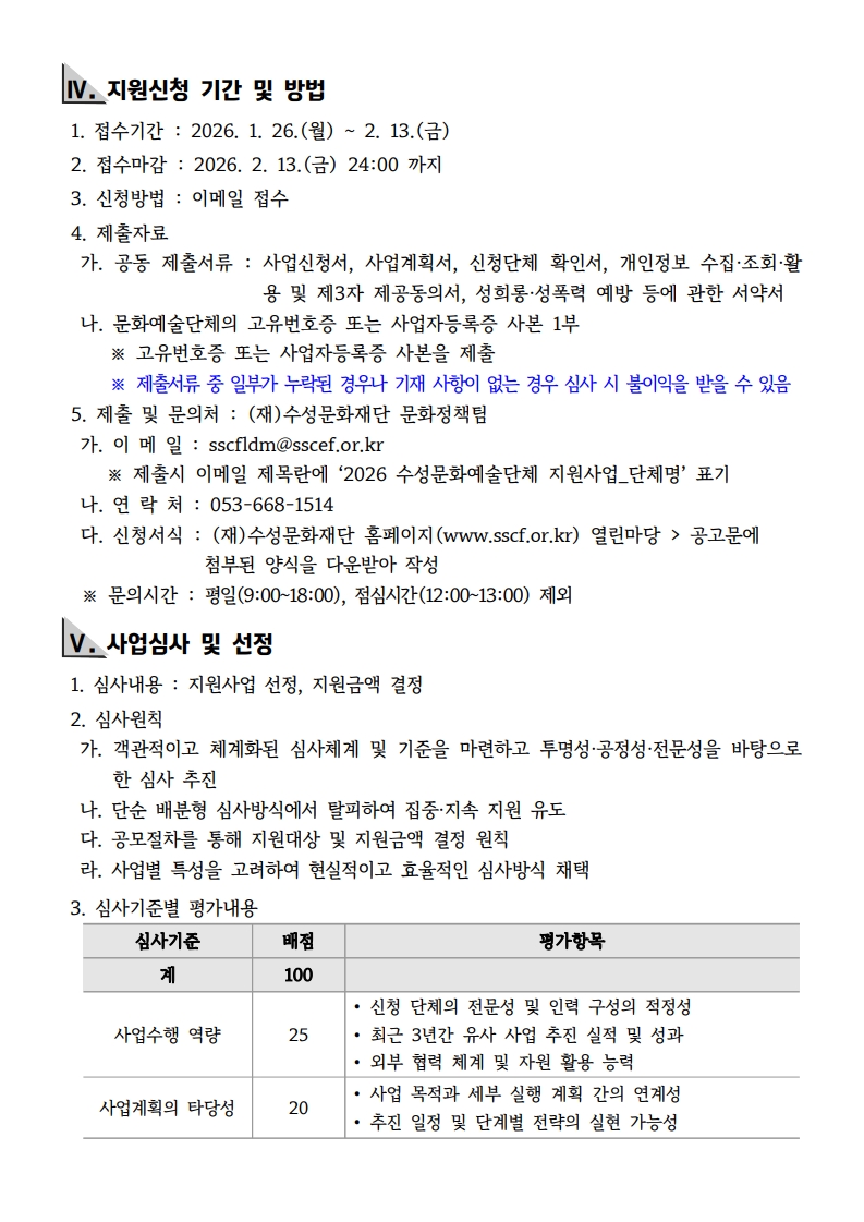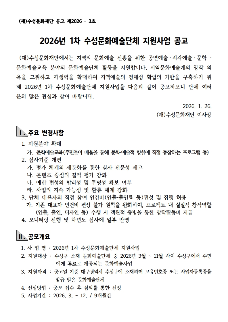 [수성문화재단] 2026년 1차 수성문화예술단체 지원사업 공고