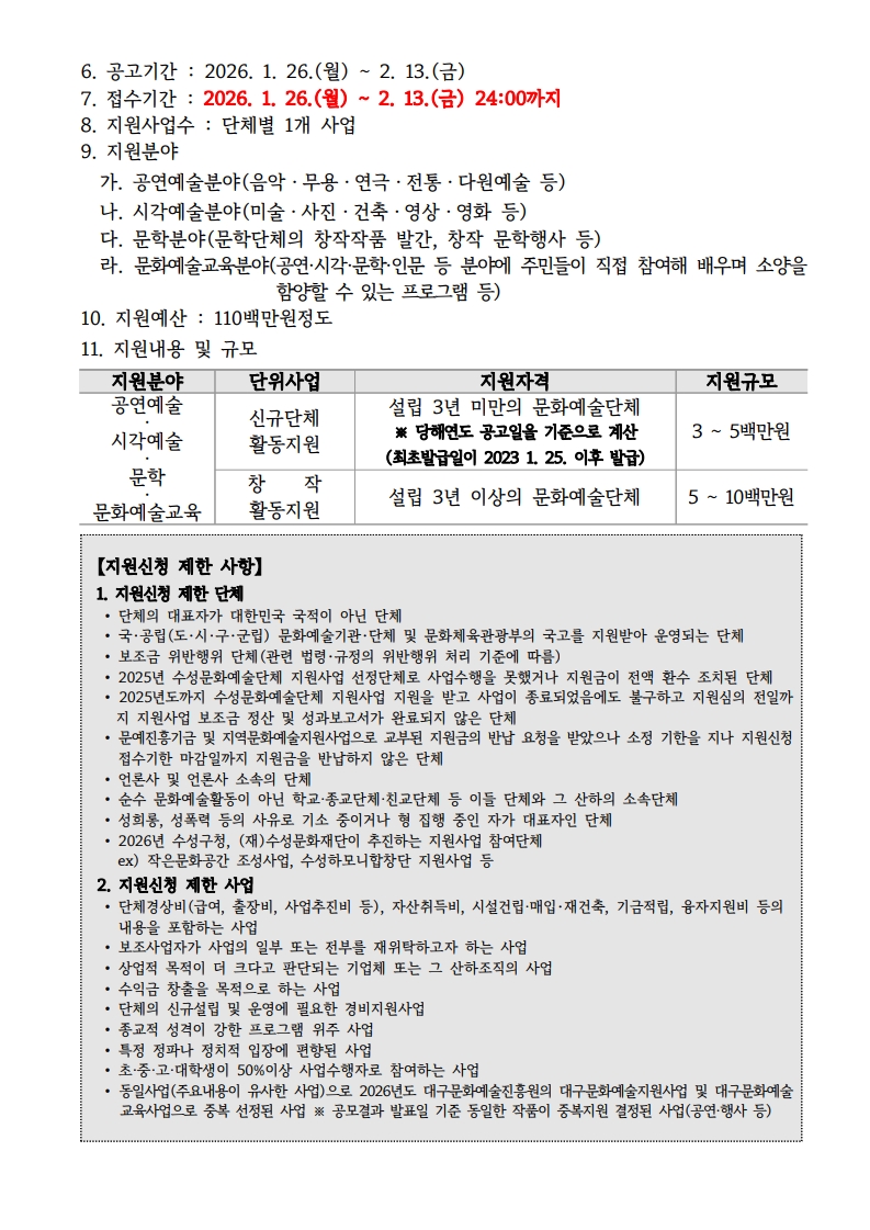 2026년도 대구문화예술지원사업 (구. 지역문화예술지원사업) 공모 공고