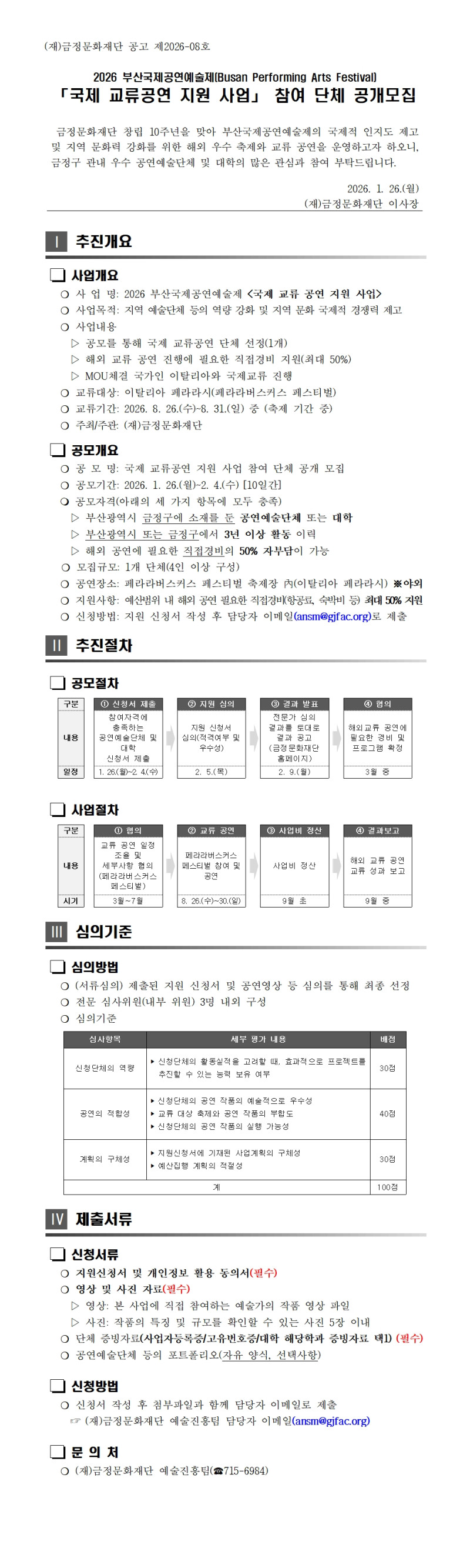 [금정문화재단] 2026년 부산국제공연예술제 국제 교류공연 지원 사업 참여 단체 공개 모집