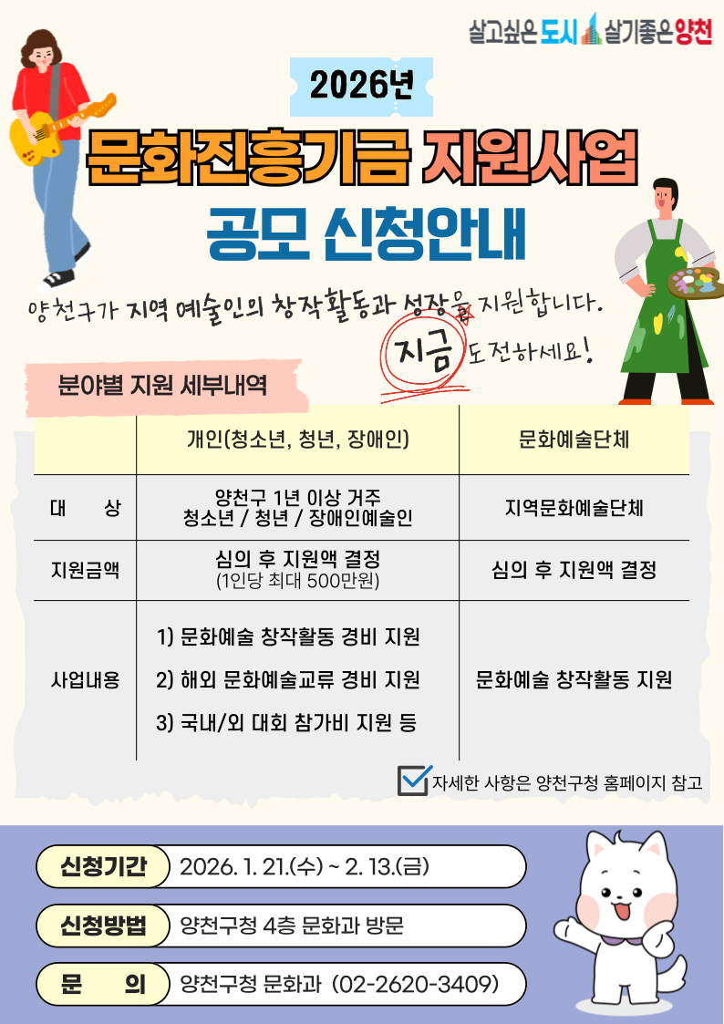 [회원등록공고] 청년, 청소년 예술인을 위한 「2026년 양천구 문화진흥기금 지원사업」 공모