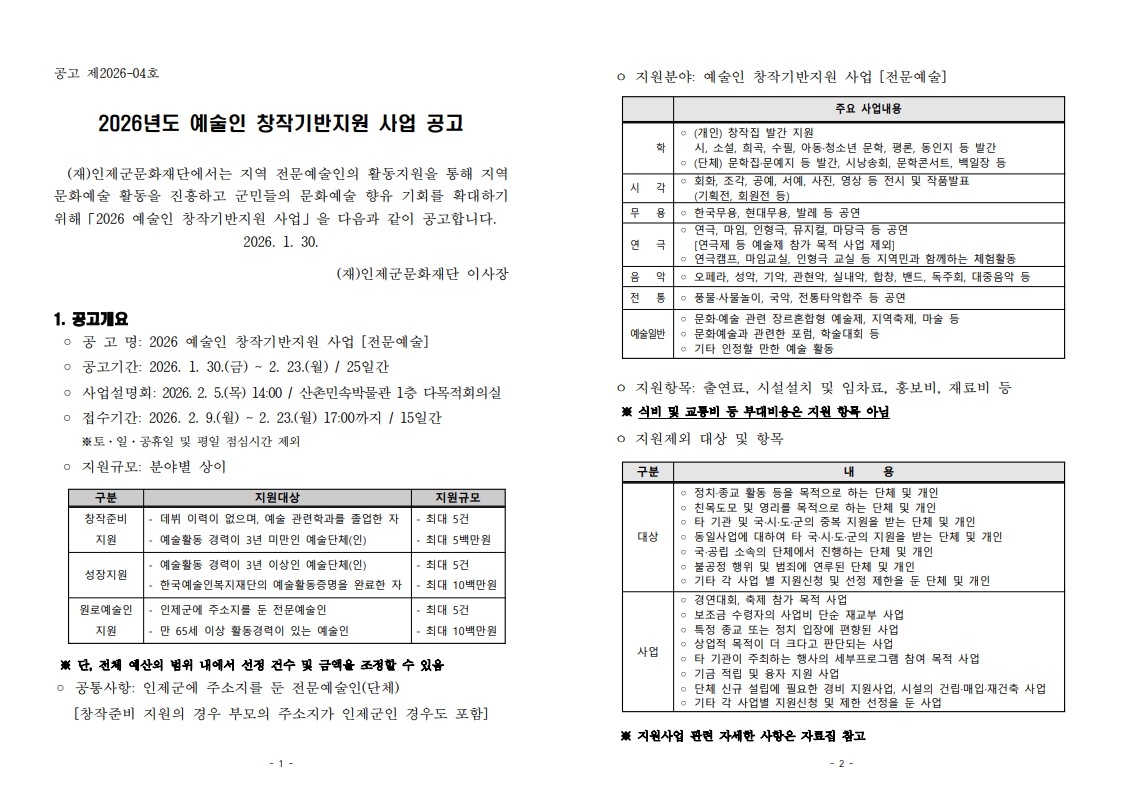 [인제군문화재단] 2026 문화예술지원사업 모집 공고