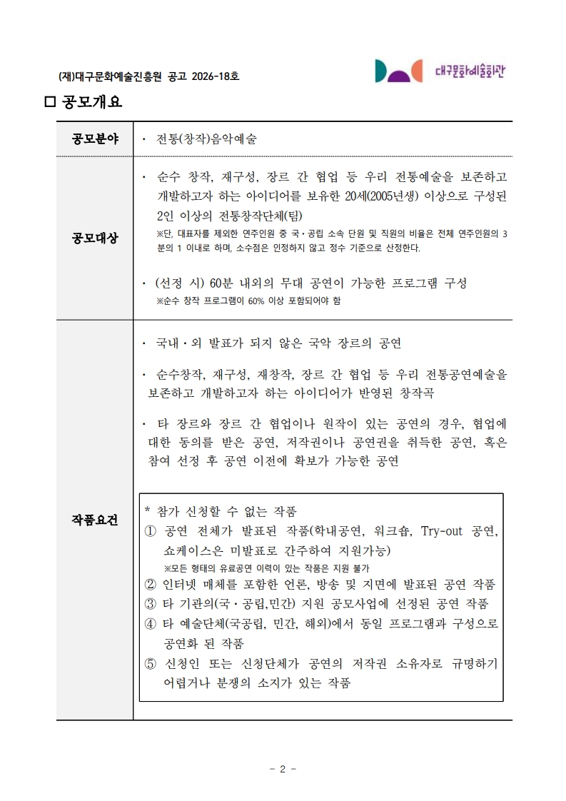 [대구문화예술진흥원] 2026 대구문화예술회관 국악인 인큐베이팅 사업 참여단체 공고