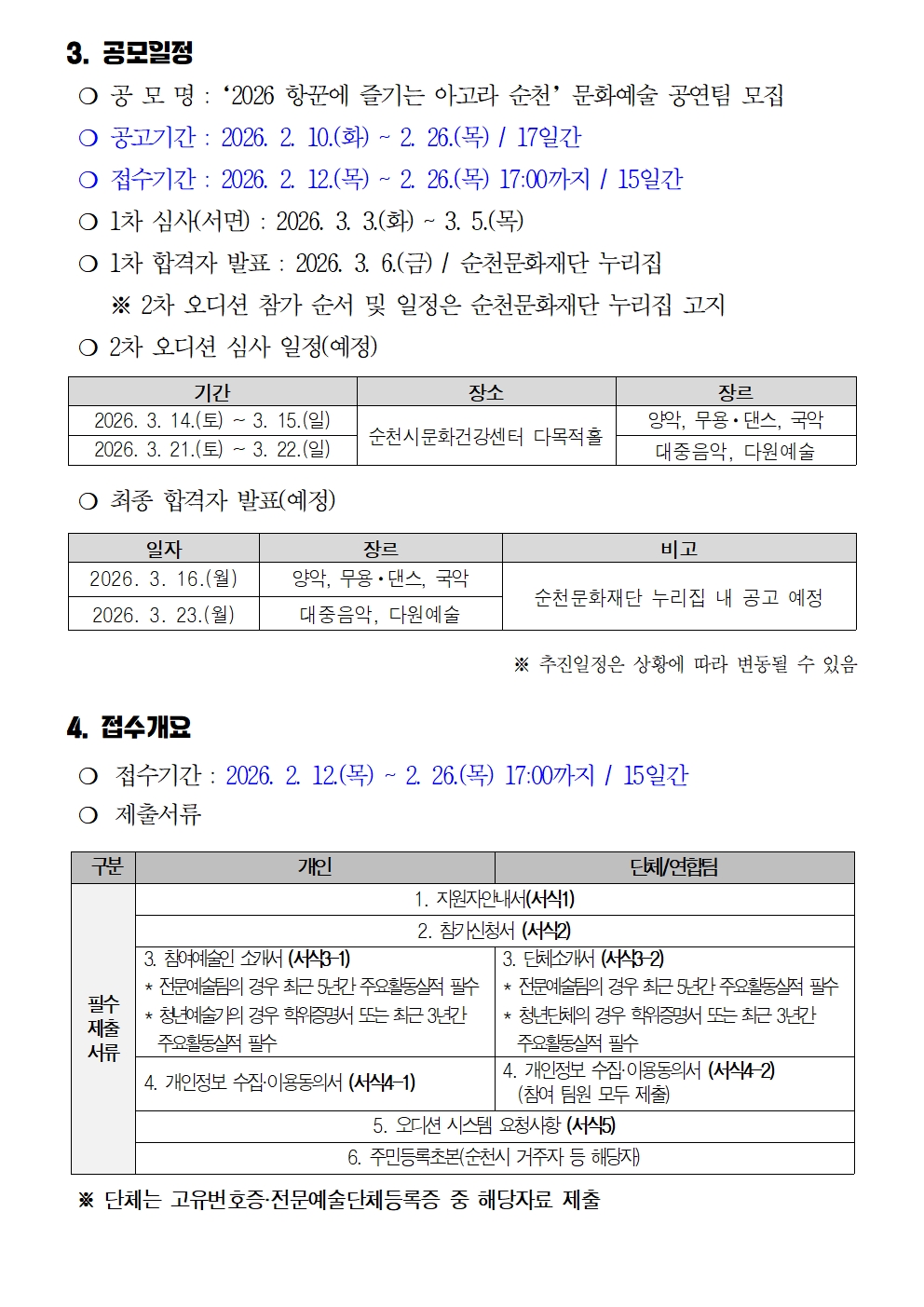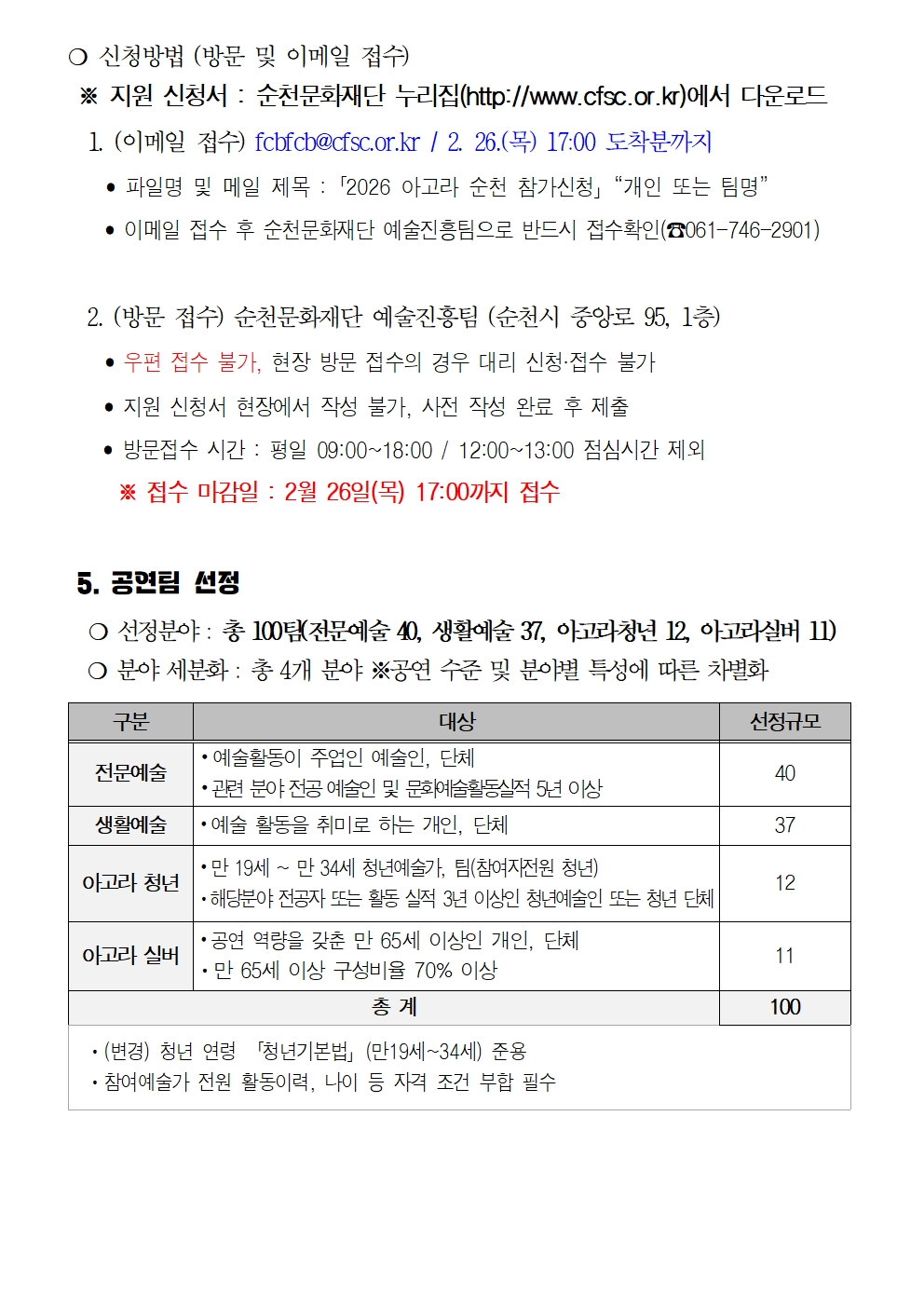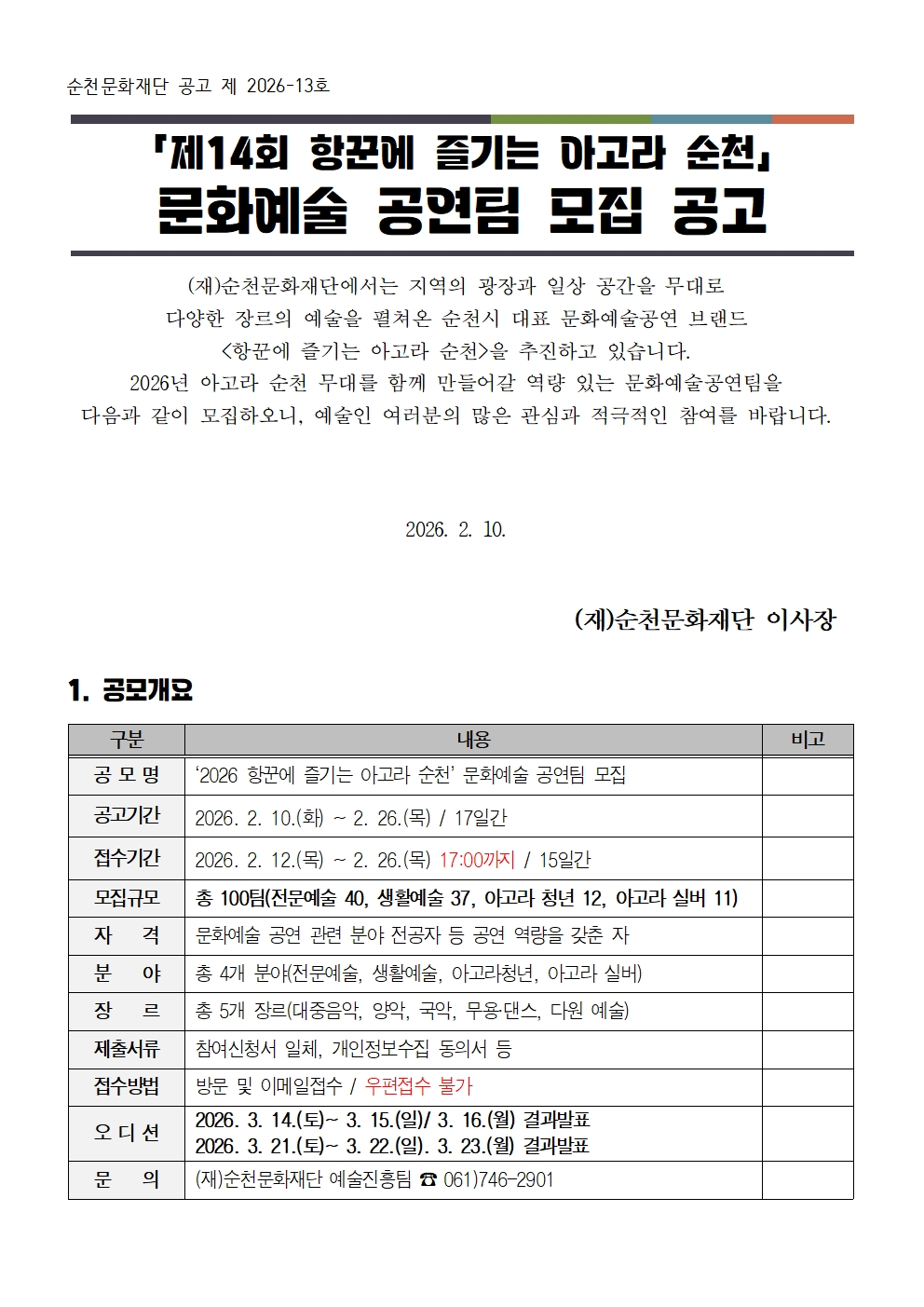 [순천문화재단] 공고「2026 항꾼에 즐기는 아고라 순천」문화예술 공연팀 모집 공고