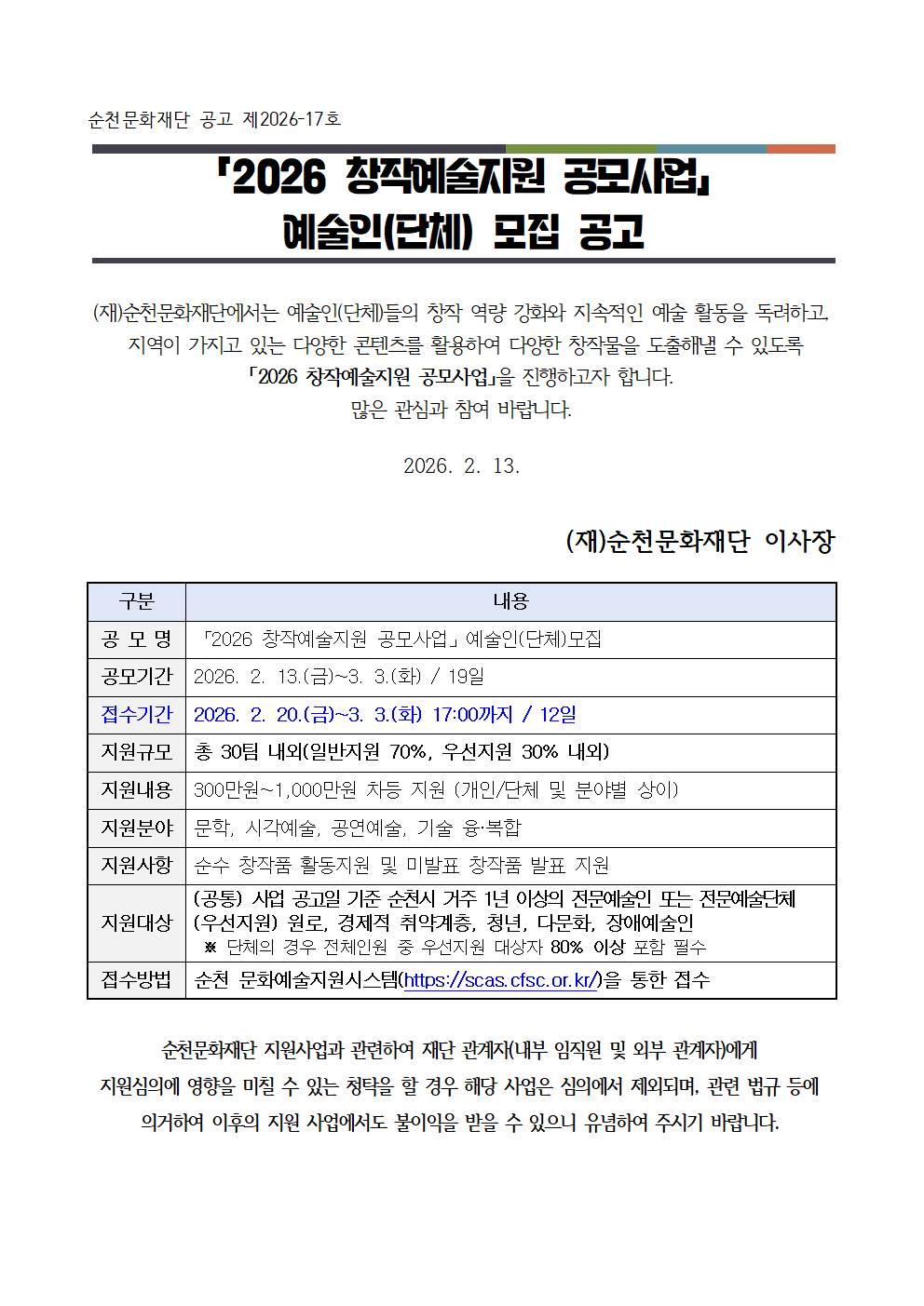 [순천문화재단] 공고「2026 창작예술지원 공모사업」예술인(단체) 모집 공고