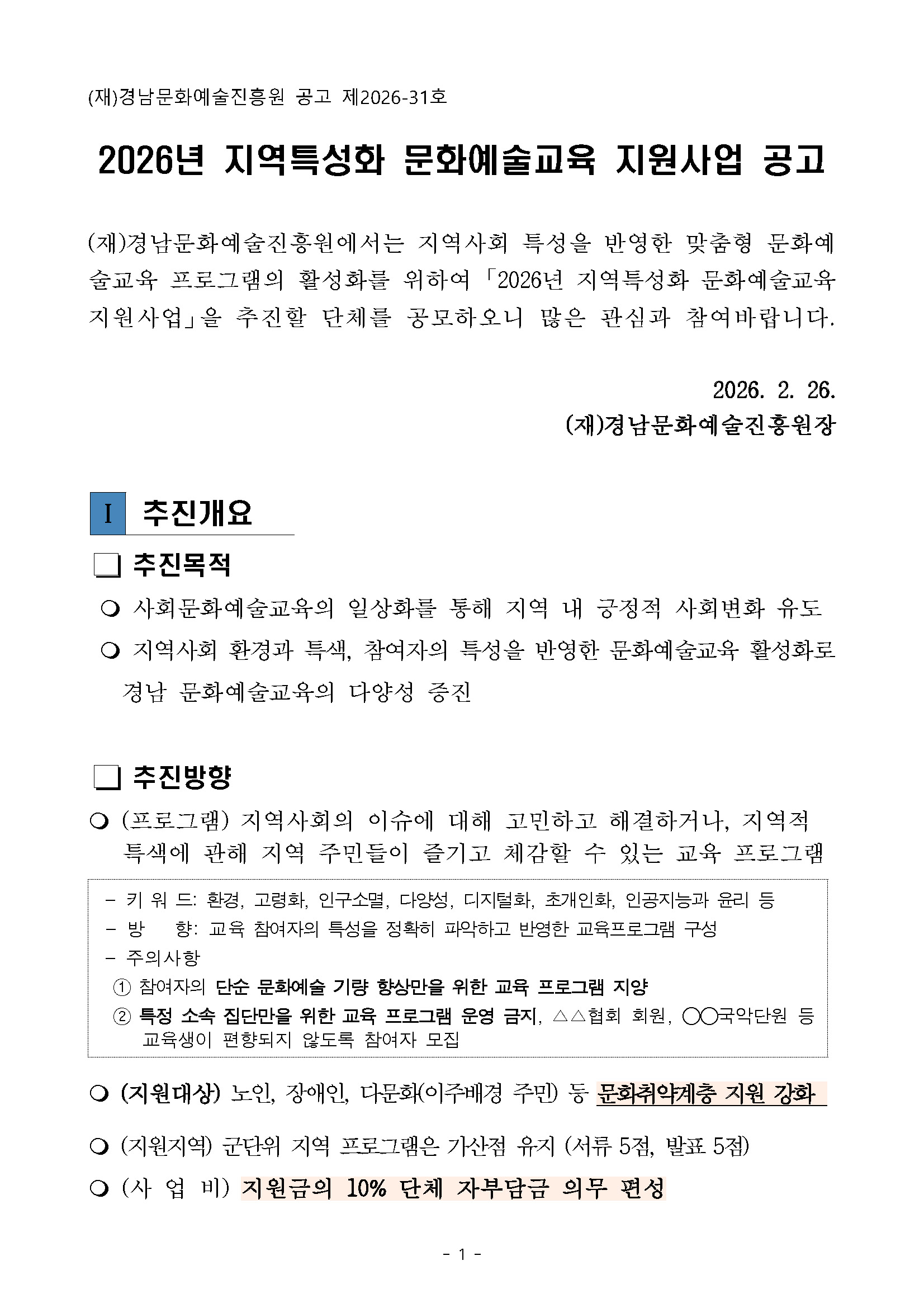 [경남문화예술진흥원] 2026 지역특성화 문화예술교육 지원사업 공모