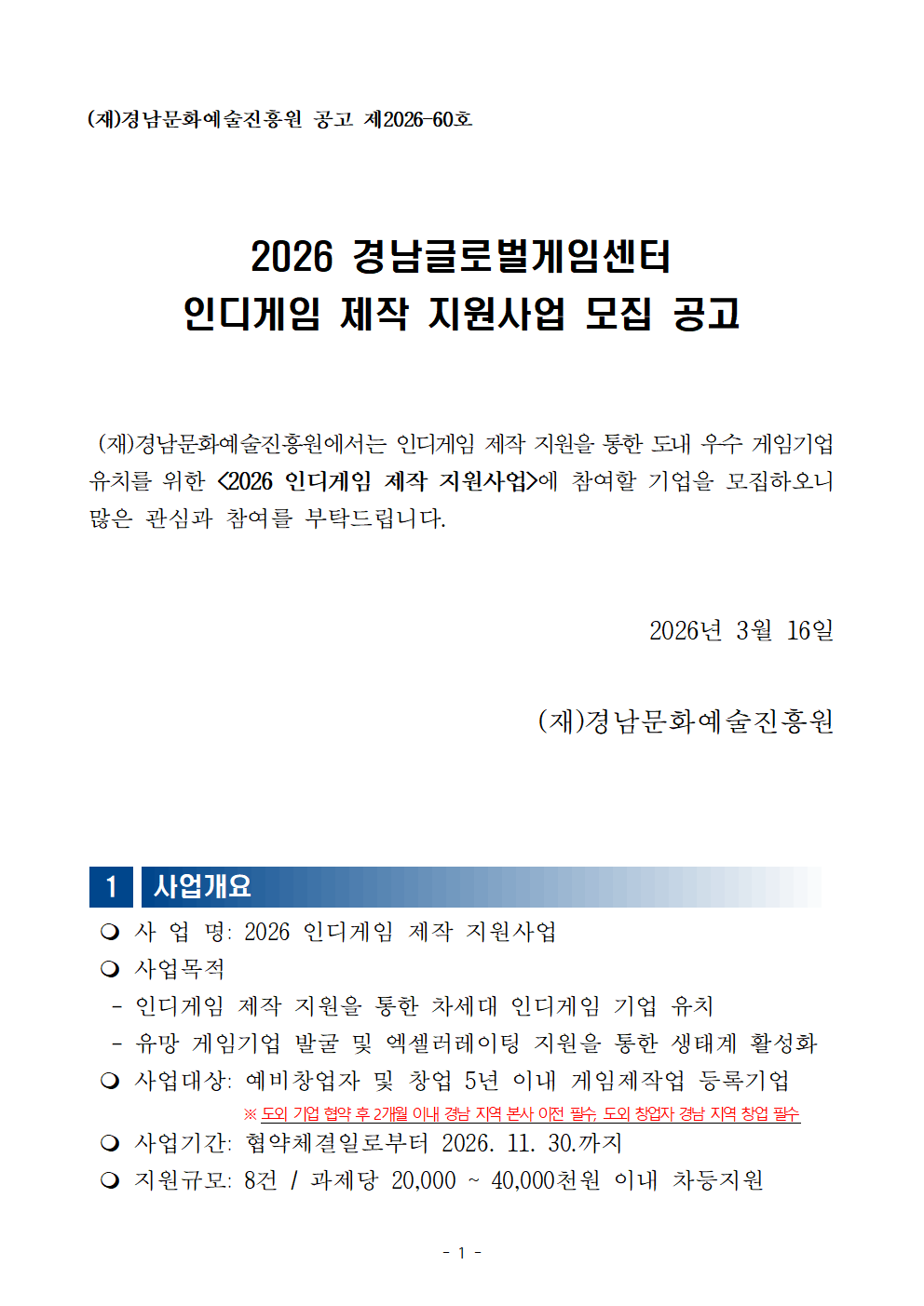 [경남문화예술진흥원] 2026 경남글로벌게임센터 인디게임 제작지원기업 모집 공고