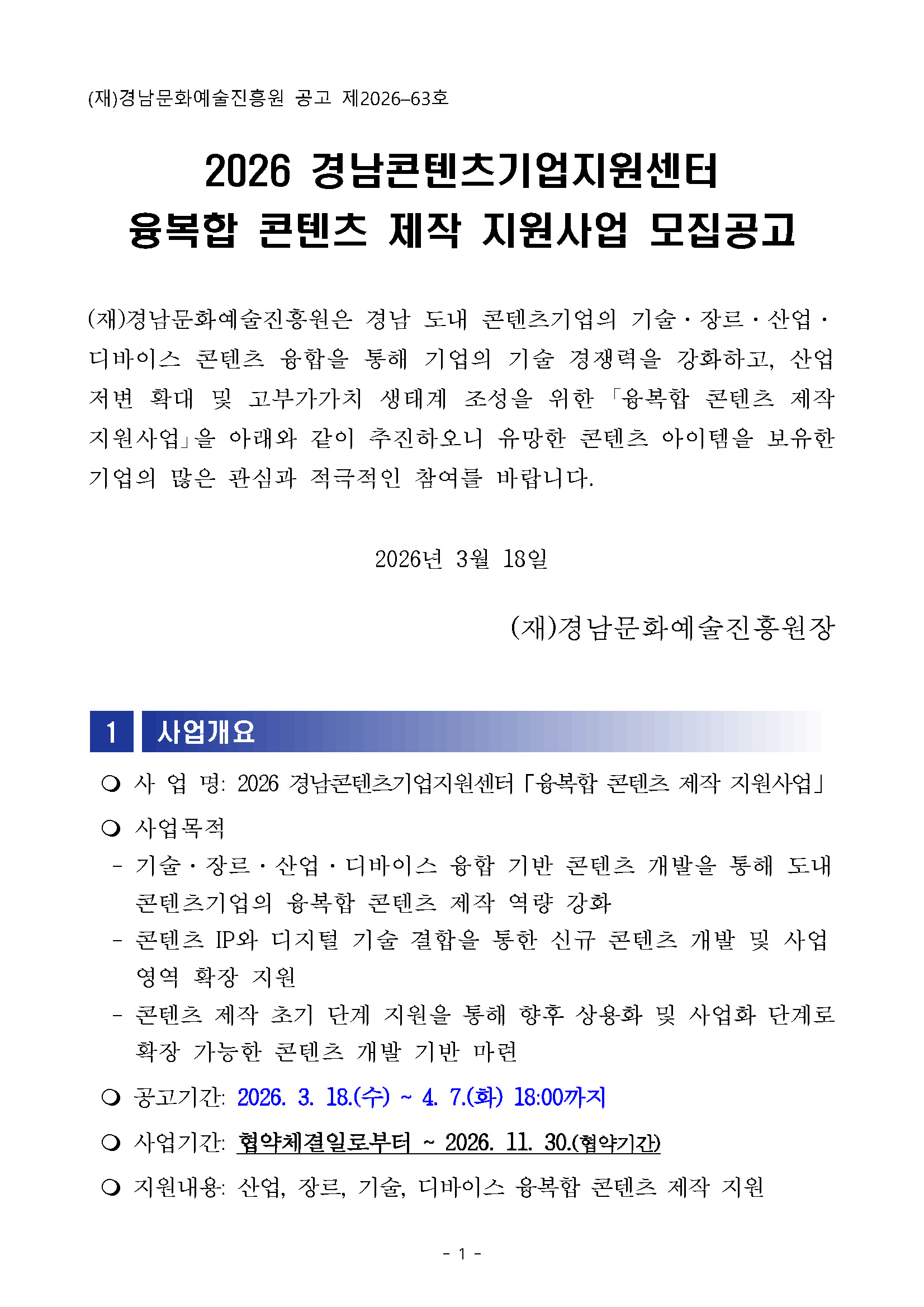 [경남문화예술진흥원] 2026 경남콘텐츠기업지원센터 융복합 콘텐츠 제작 지원사업 모집공고