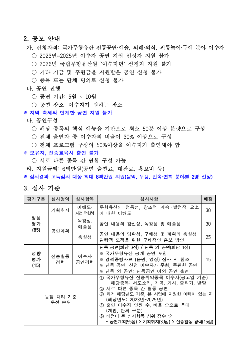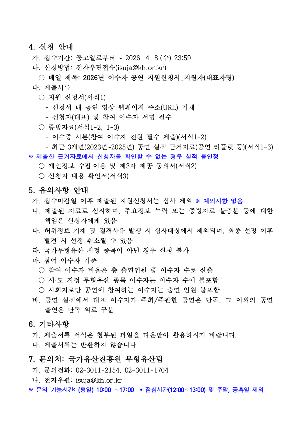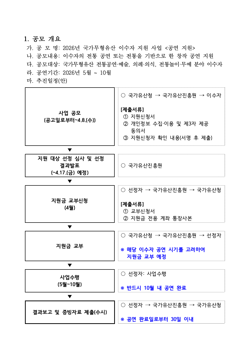 [국가유산진흥원] 2026년 국가무형유산 이수자 지원 사업 공연 지원 공모 안내