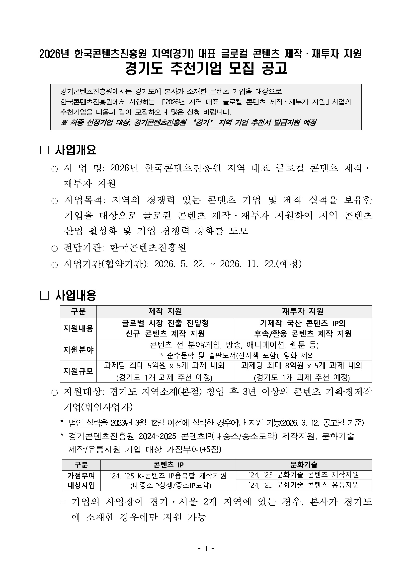 [경기콘텐츠진흥원] 2026 한국콘텐츠진흥원 지역(경기) 대표 글로컬 콘텐츠 제작/재투자 지원사업, 경기도 추천기업 모집 공고