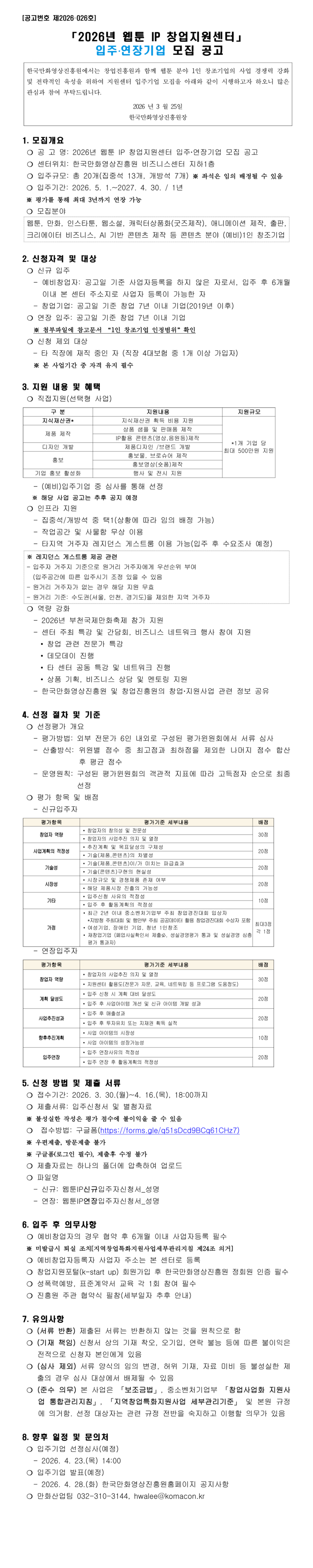 [한국만화영상진흥원] 2026년 웹툰 IP 창업지원센터 입주기업 모집